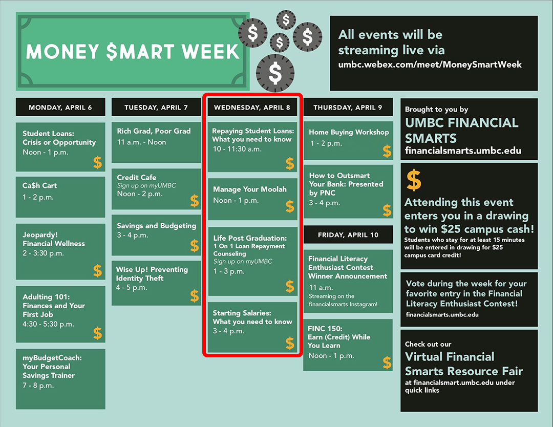 Congratulations to our Day 3 Raffle winners! Taylor West, DeJia Long-Hillie, Taronica and Andres Burgos all won $25 campus cash just by attending a Money Smart Week workshop! Join us today and you could win too!