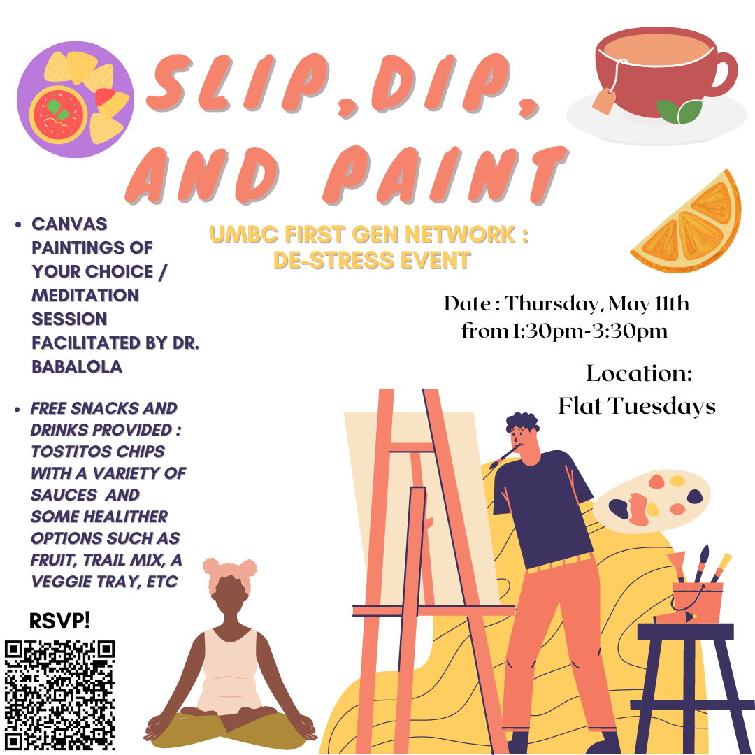 On Thursday, May 11th from 1:30pm-3:30pm in Flat Tuesdays, UMBC First-Generation Network will be having a De-Stress event to help students relieve some stress before final exams. There will be free snacks, drinks, activities, and an opportunity to participate in a meditation session facilitated by Dr. Babalola (alum of UMBC).