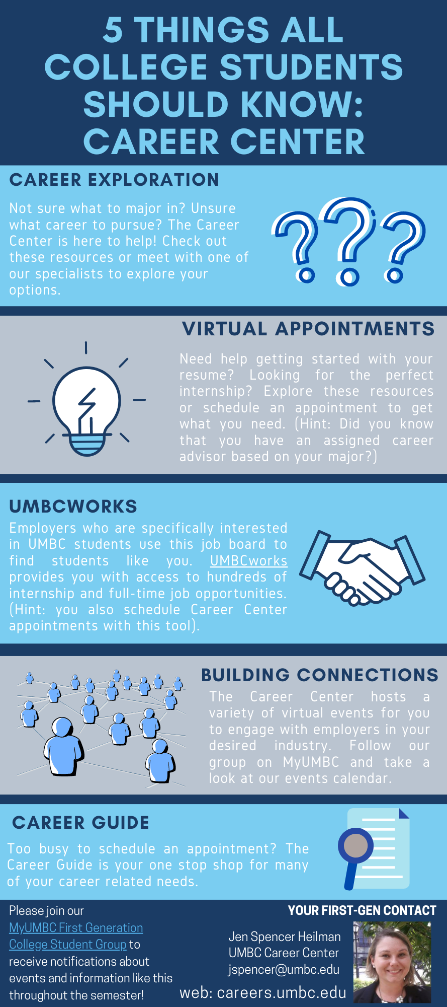 4). Building Connections: The Career Center hosts a variety of virtual events for you to engage with employers in your desired industry. Follow our group on MyUMBC and take a look at our calendar here to stay up to date on what’s happening!
