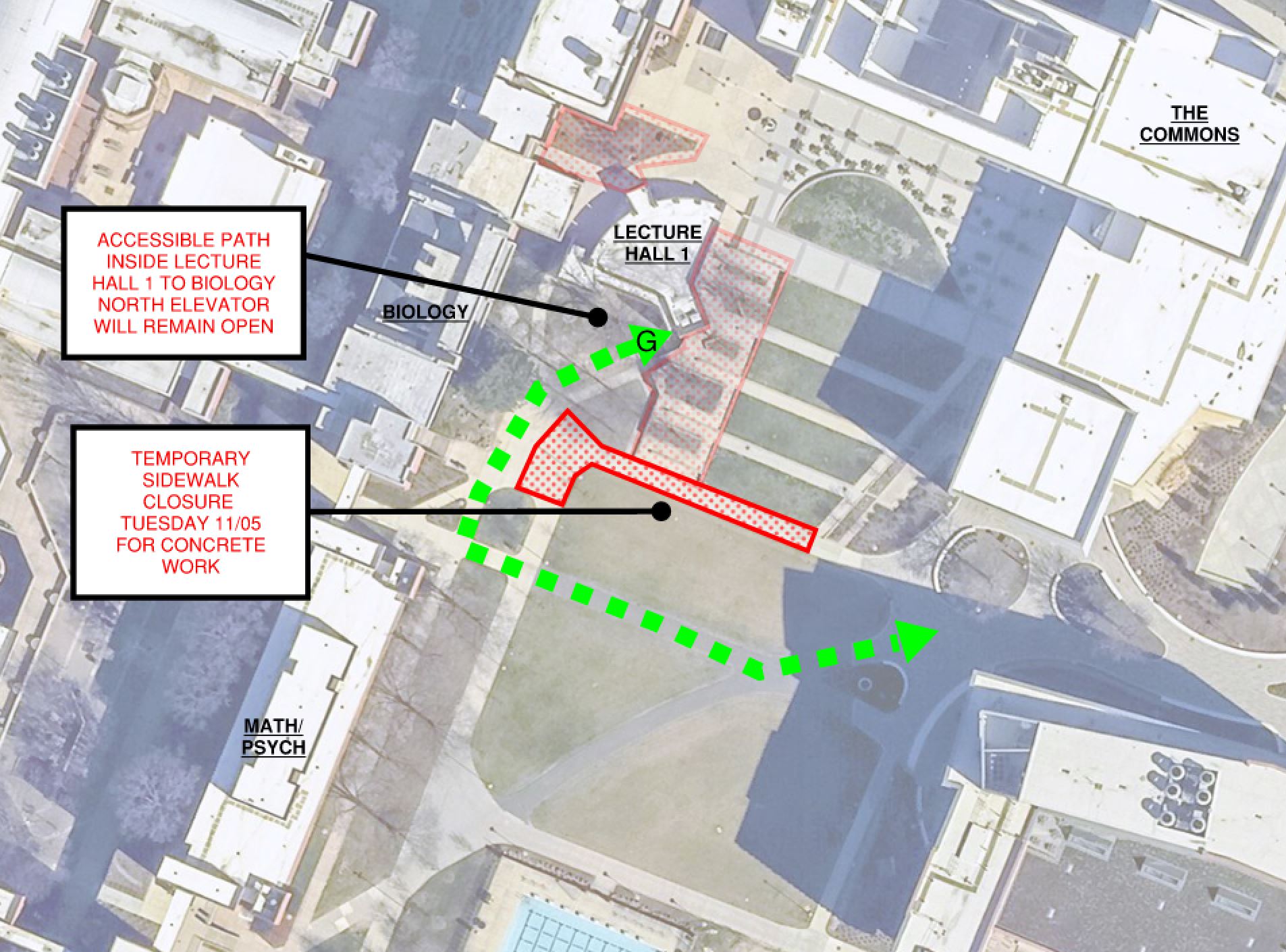 On Tuesday, 11/05/2024 between 7 AM and 4 PM, a section of sidewalk at the north end of the Quad will be temporarily closed to complete the remaining concrete work for the Lecture Hall 1 renovation. Signage will redirect pedestrians to an accessible route through The Quad. The accessible route from Lecture Hall 1 to the lower level of Biology will also remain open during this work. Please refer to the attached graphic for additional information.