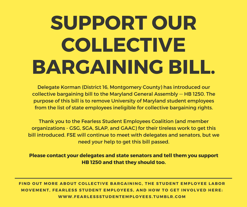 A student advocacy group at College Park, the Fearless Student Employees coalition (made up of the student government and GAAC), has been working on a bill to allow all Maryland system student employees the right to collectively bargain. The bill, HB 1250, has a hearing at 3:00 pm today in Annapolis.
