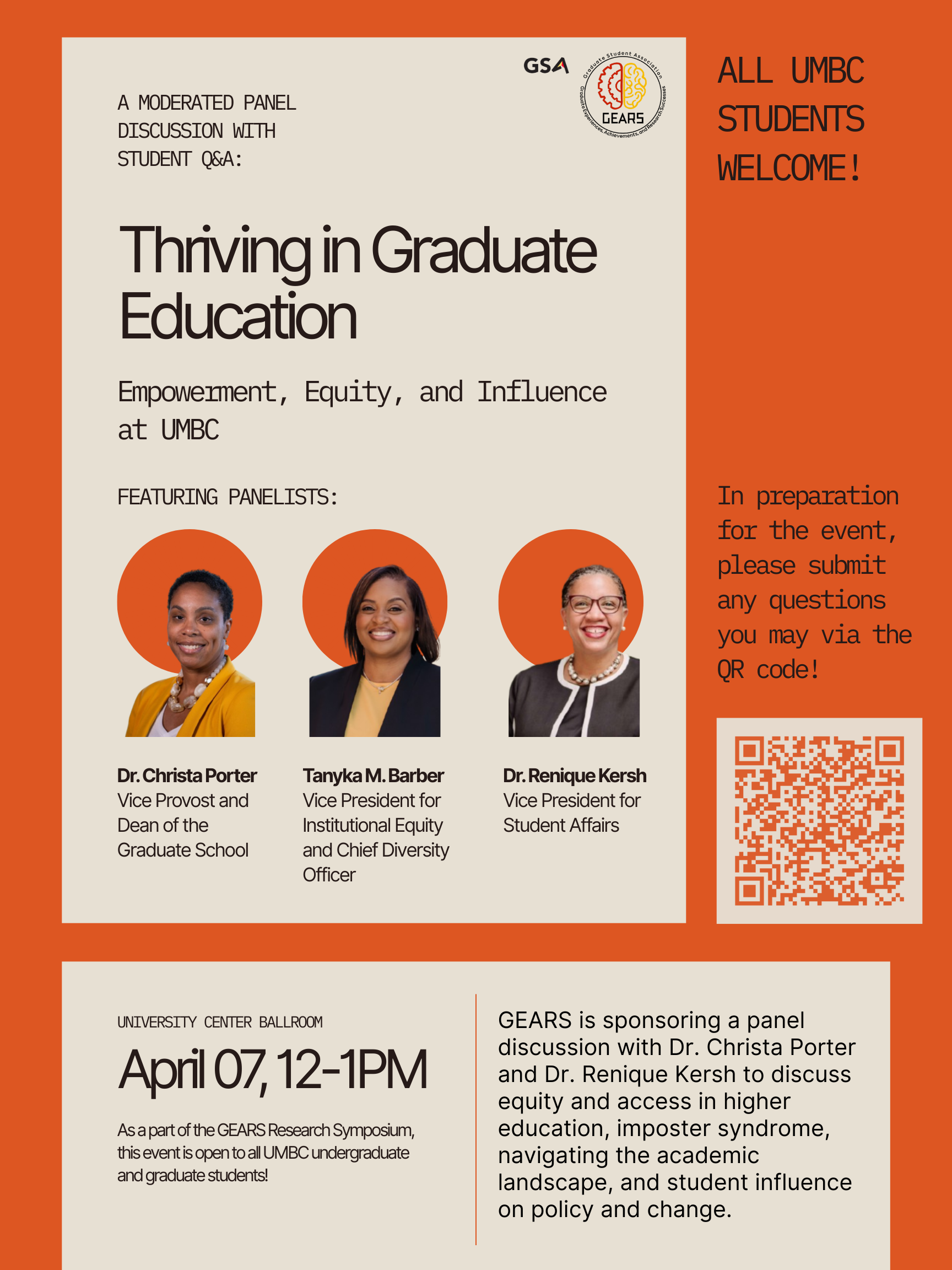 As a part of the annual UMBC GEARS Research Symposium, we will be sponsoring a panel discussion, titled "Thriving in Graduate Education: Empowerment, Equity, and Influence at UMBC". It is open to all UMBC undergraduate and graduate students.