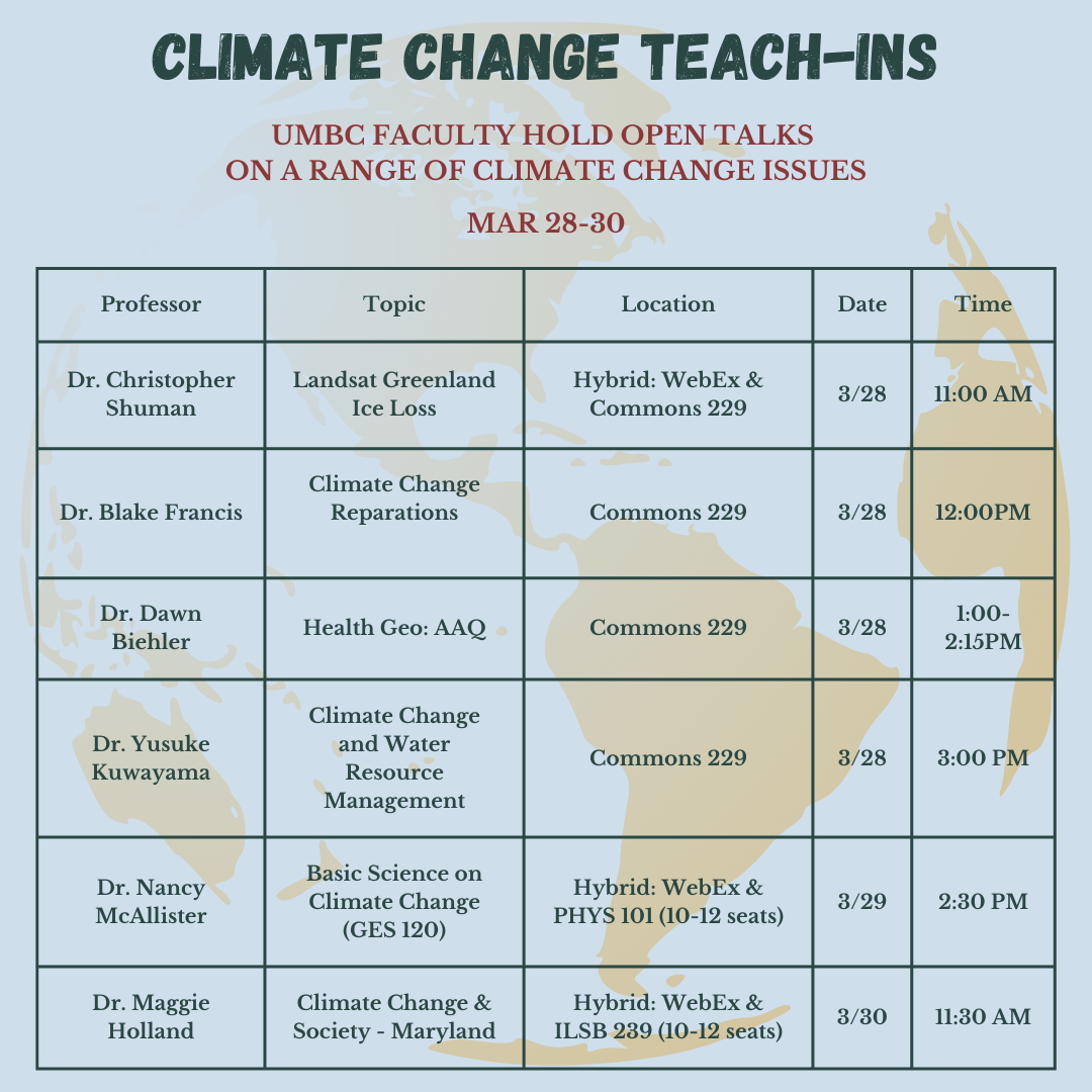 UMBC faculty will be giving open talks on a range of climate change issues from Tuesday March 28th through Thursday March 30th. Come learn more about the science behind climate change and its impacts, as well as the solutions and strategies being developed to address climate change challenges. See below for more information.