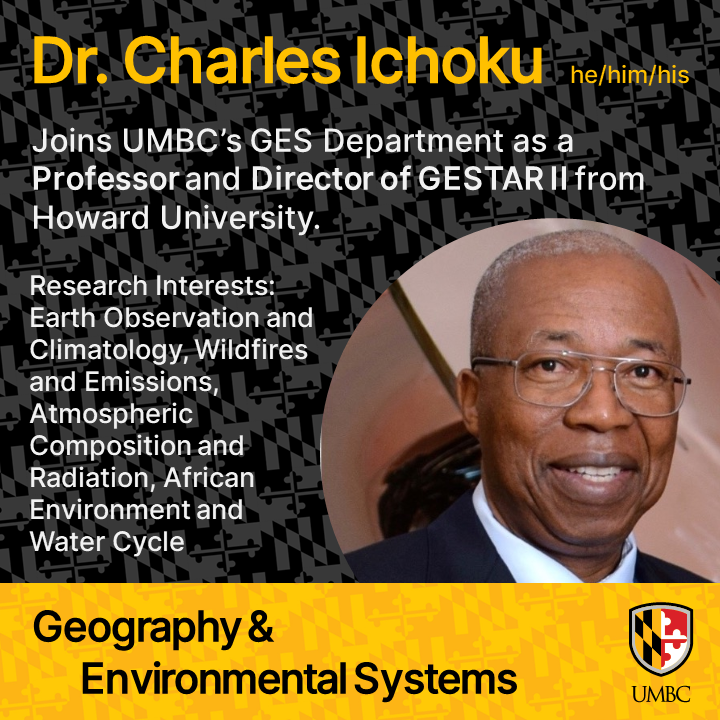 Dr. Ichoku joins us from Howard University and has a distinguished teaching and research career in the earth and environmental sciences, including previously serving as the Distinguished Scientist of the National Oceanic and Atmospheric Administration (NOAA) Cooperative Science Center in Atmospheric Sciences and Meteorology (NCAS-M). You can read more about the extensive experience Dr. Ichoku brings to our department and to the NASA-supported work of GESTAR II in the UMBC news article by Sarah Hansen linked below.