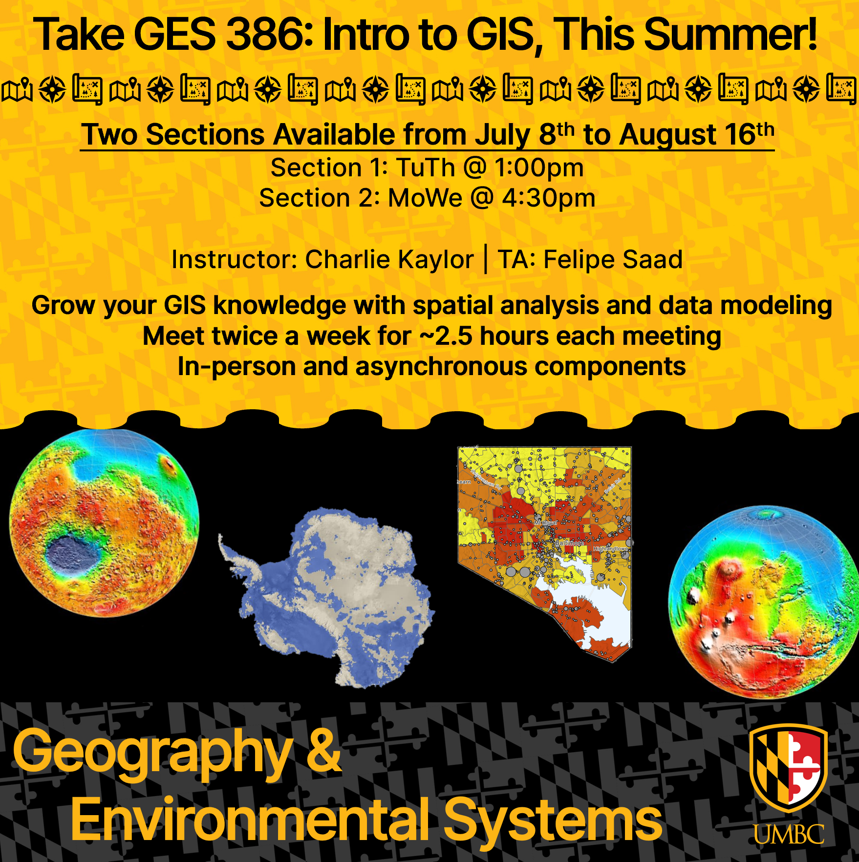 Professor Kaylor will be teaching two sections of GES 386 during UMBC’s Summer Session II. One section will meet on Tuesday and Thursday at 1pm, and the other on Monday and Wednesday at 4:30pm. Each meeting will last about 2.5 hours with additional time allotted for working on assignments in the computer lab.