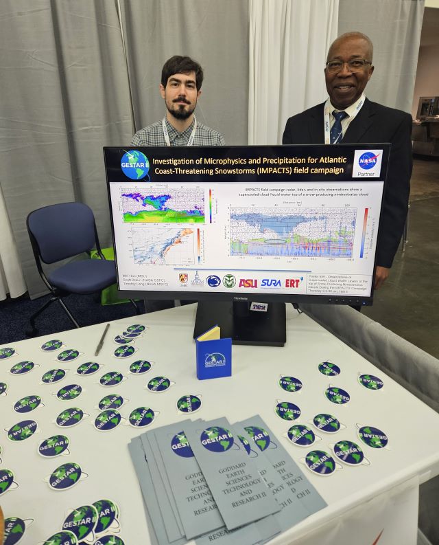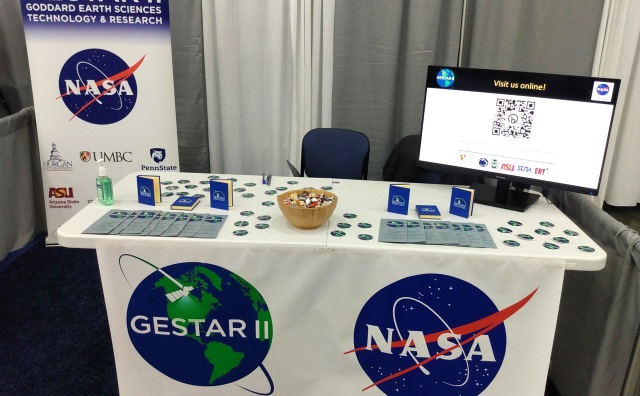 The 104th American Meteorological Society (AMS) Meeting was held in Baltimore, MD, from January 29 - February 1, 2024. GESTAR II set up a booth at the meeting with a PowerPoint presentation, highlighting research from various scientists, as well as brochures, stickers, and candy! We also had on display a model of the HARP-2 polarimeter, which is on the PACE satellite and was built by UMBC's Earth and Space Institute. GESTAR II's director and associate directors from partner universities along with some of ESRA's and SURA's leadership and staff plus GESTAR II scientists were all in attendance. Additionally, several GESTAR II UMBC and MSU students presented at AMS (see separate post).