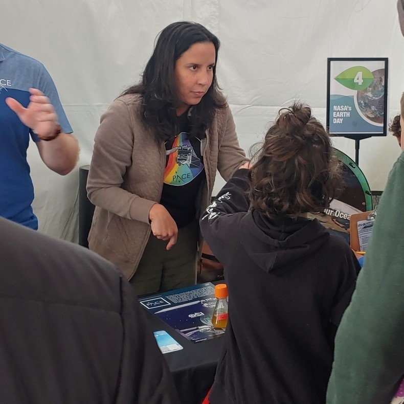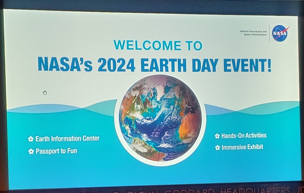 At NASA HQ, attendees were divided into groups; one group was led by Caterina Mogno (614/UMBC). Additionally, Inia Soto Ramos (616/MSU) staffed one of the information tables. NASA Earth Day activity topics focused on ICESat-2, PACE, JPSS, Heliophysics, Disasters, among others, and the event provided immersive and augmented reality experiences.