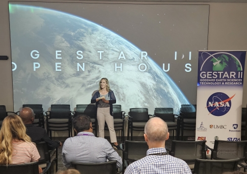 On July 23, 2024, members of GESTAR II leadership, UMBC leadership, and NASA Goddard leadership came together for the GESTAR II Open House, which featured earth scientists and posters, along with remarks from leadership. This presented GESTAR II scientists the opportunity to discuss their research with attendees, including sponsors, civil servants, and interns, as well as those who visited the event, which was held at NASA Goddard in Bldg. 33, Room H114. Additionally, food and refreshments were provided. Thank you to all who organized and participated and to those who stopped by!