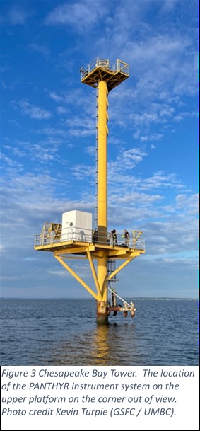 The WATERHYPERNET is a growing network with stations worldwide that provide measurements of radiance and irradiance data over water bodies. In July 2023, a new WATERHYPERNET instrument station was installed in the middle of the Chesapeake Bay, the first of its kind in North America. The station is set up to provide validation for the NASA Surface Biology and Geology mission, the NASA PACE mission, and ESA water observing missions. UMBC is responsible for station operation and maintenance as part of a collaboration with NASA GSFC, the Royal Belgian Institute of Natural Sciences, and Flanders Marine Institute. The installation, which started in July 2023, required several trips to the tower to become operational.