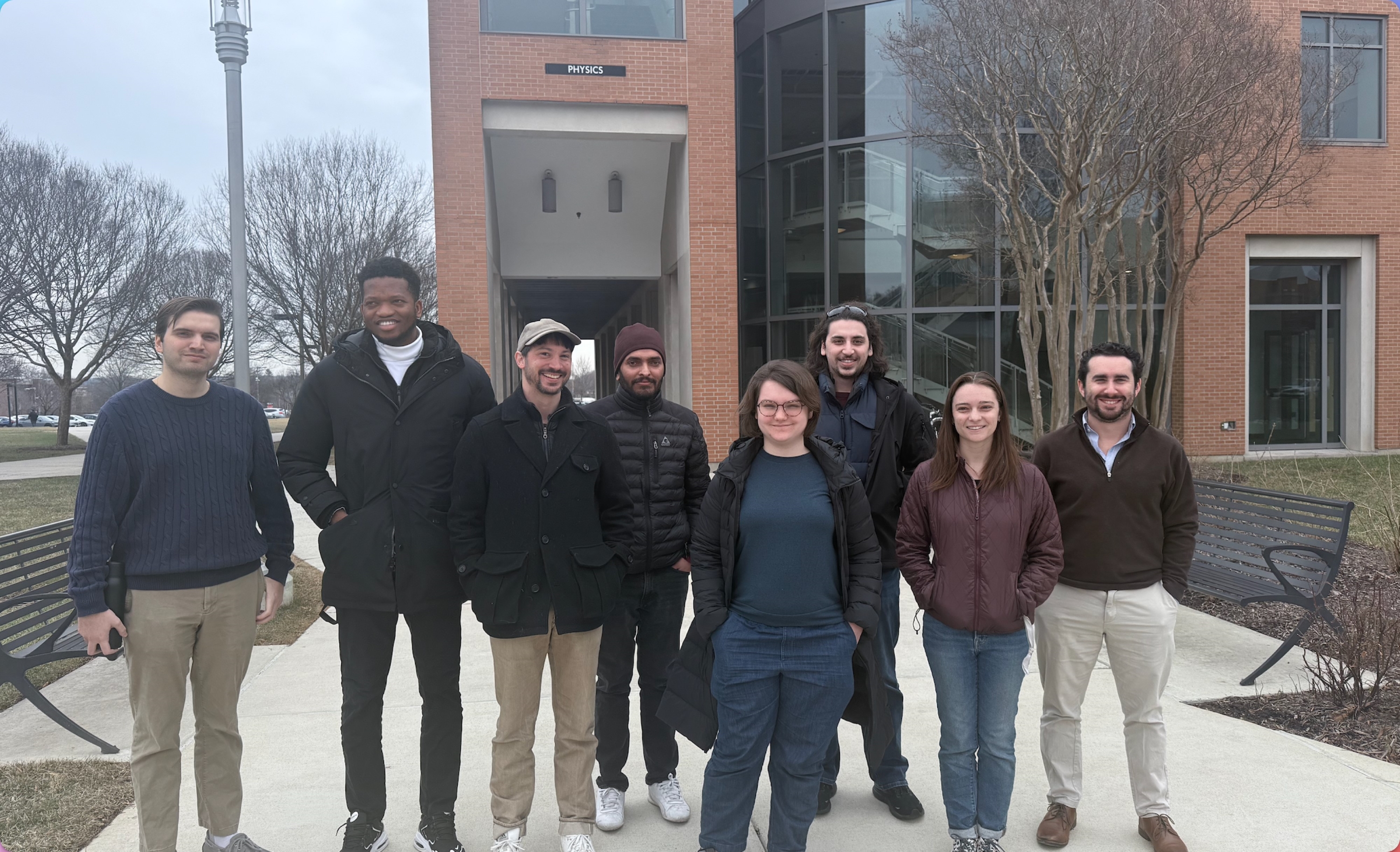 Photo: First colloquium attendees included graduate students along with Dr. Brent McBride outside of the Physics Building. (Credit: Z. Zhang.)