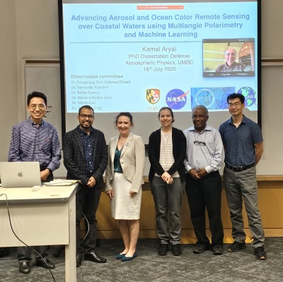 GESTAR II congratulates Kamal Aryal, who defended his Ph.D. dissertation in Physics on July 16, 2025. His dissertation was titled "Advancing Aerosol and Ocean Color Remote Sensing Over Coastal Waters Using Multiangle Polarimetry and Machine Learning," and his advisor was Dr. Pengwang Zhai, Professor, Physics/UMBC. Kamal previously was selected as GESTAR II UMBC Graduate Fellow, 2024-2025, and he recently joined GESTAR II as a Postdoctoral Research Associate, working in the Ocean Ecology Laboratory (Code 616) at NASA Goddard Space Flight Center.