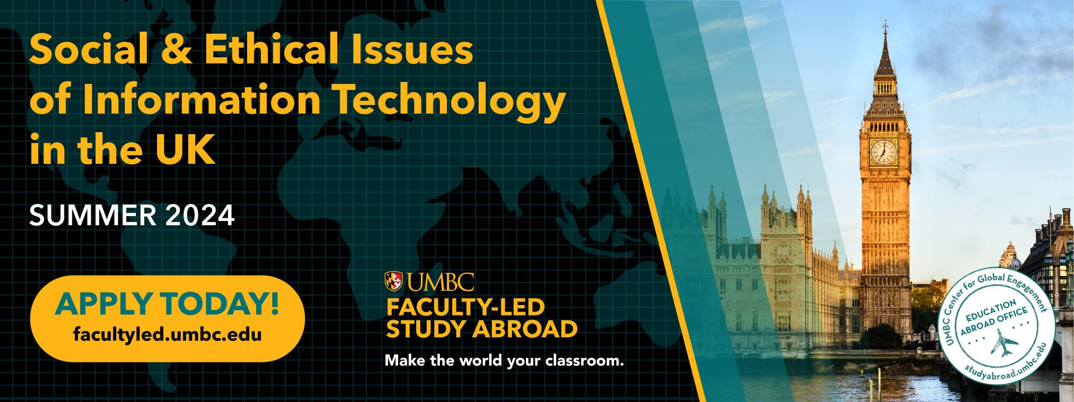 The deadline for this summer's faculty led study abroad program Social and Ethical Issues in Information Technology (CMSC 304) in England had been extended! The deadline to apply is now Monday, February 26th. Course prerequisites are waived for anyone who wants to participate (ENGL 100 prerequisite still applies). This course is open for students in all majors and will meet the Study Abroad/Global Experience requirement for GLBL majors, in addition to fulfilling an Arts and Humanities GEP, and providing three upper level credits! This is an excellent opportunity for GLBL majors interested in security, privacy rights, and international data flow. This course will provide insights into foreign laws and ethical considerations to broaden student perspectives on the global nature of computer science and information technology