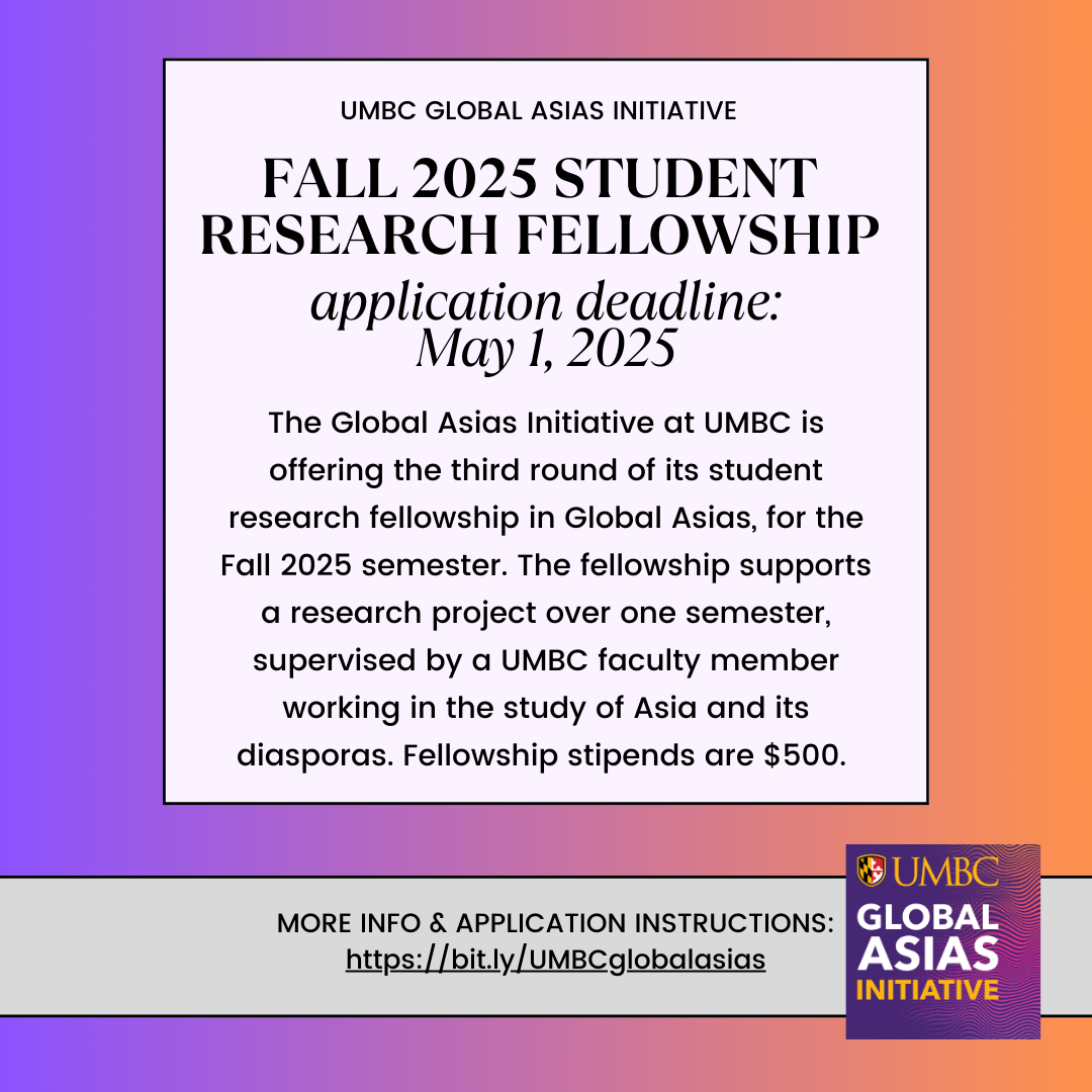 The Global Asias Initiative at UMBC is now offering the third round of its student research fellowship in Global Asias in the amount of $500 where students will work with faculty and community partners on an independent study in the field for a period of one semester. We’re currently accepting applications for projects taking place in Fall 2025.