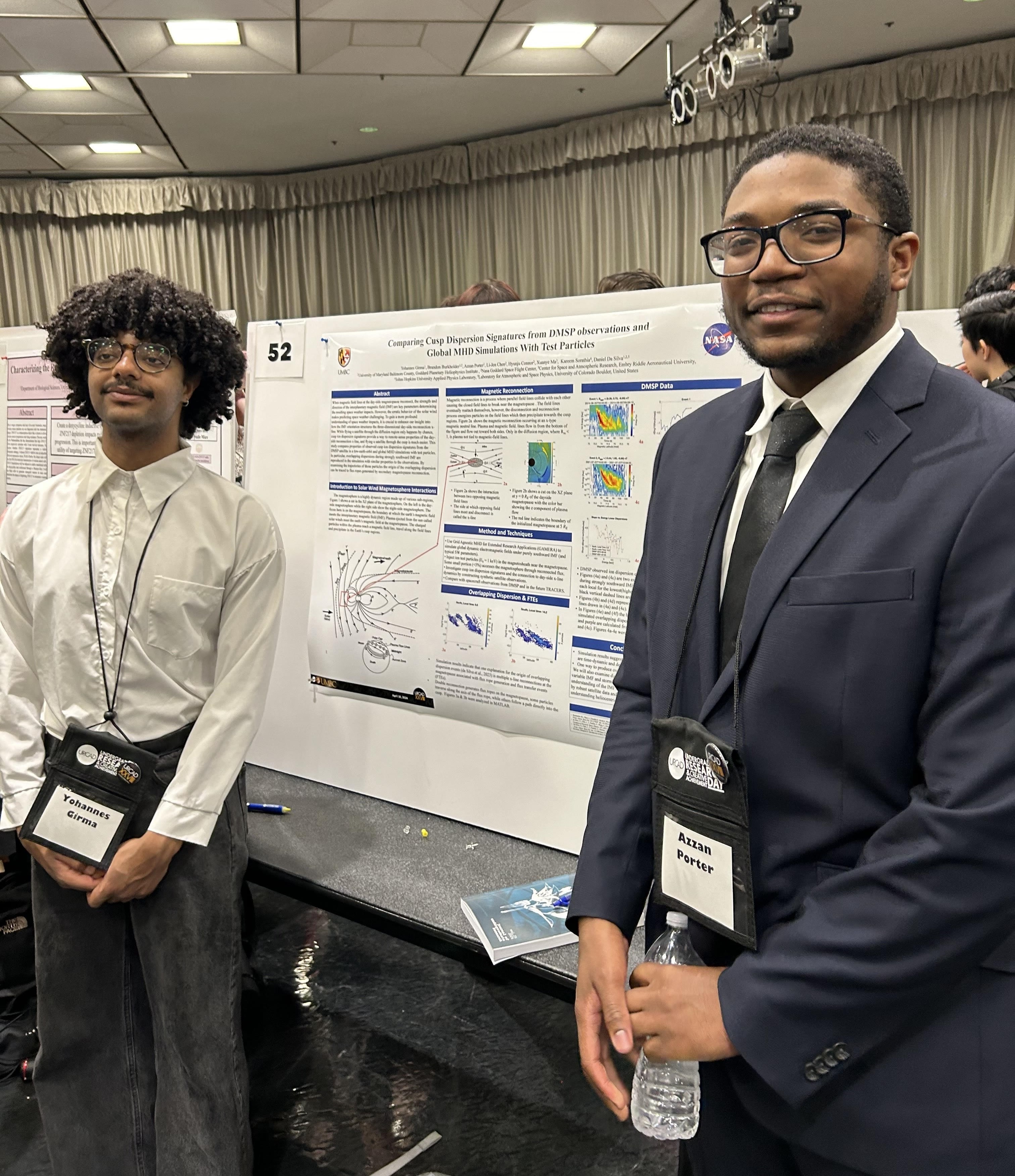 Yohannes Girma and Azzan Porter are both physics majors at UMBC. Yohannes Girma works with global magnetohydrodynamic simulations of Earth's magnetosphere, and Azzan Porter analyzes observations from different spacecraft in the magnetosphere. Says Dr. Burkholder, "Our science will help to better predict extreme space weather events and their impacts on technology and society."