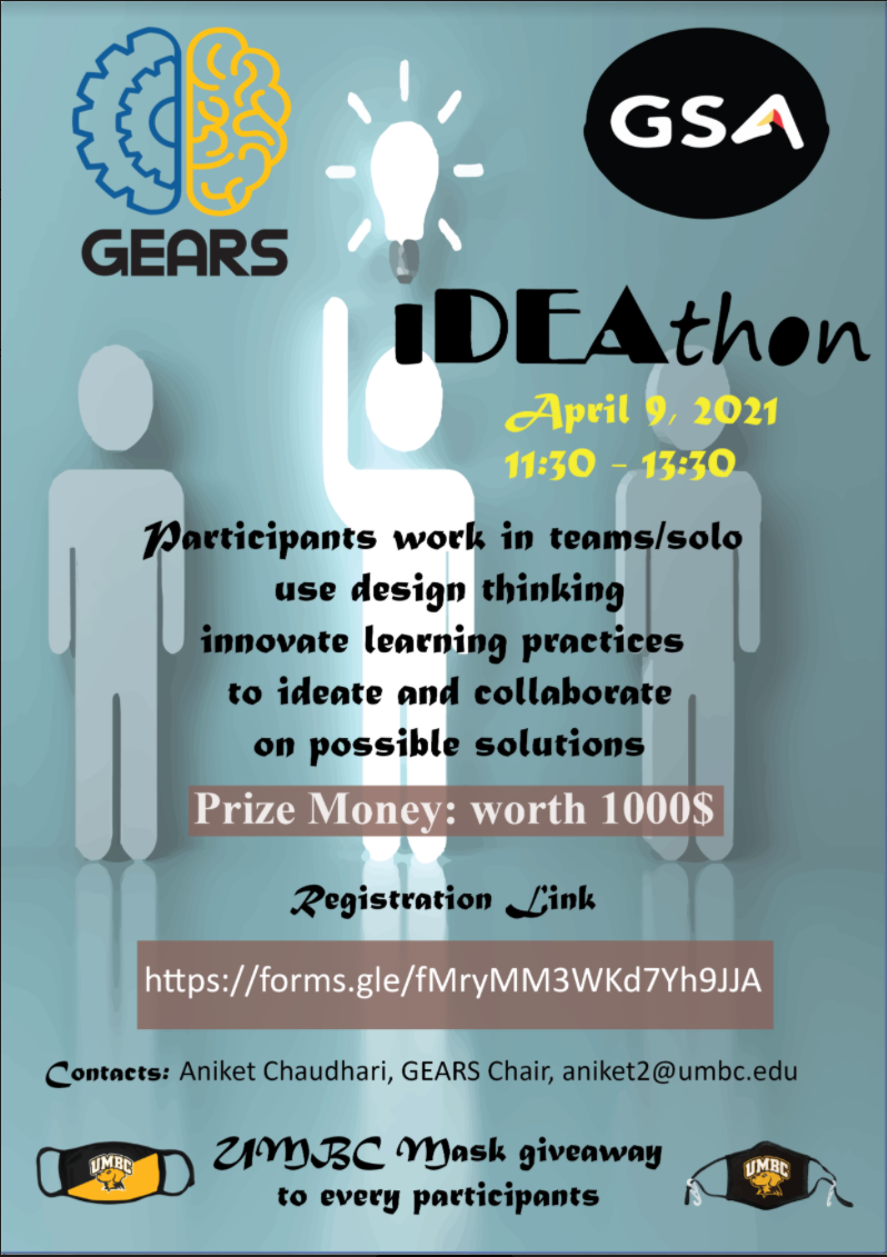 We at Gears invite you to our first-of-a-kind event IDEATHON. How can new or existing problems can be tackled better by using your unique idea? IDEATHON is all about presenting your unique idea to the jury and fellow graduate students in UMBC. You can participate either individually or in a group of no more than 3 people.