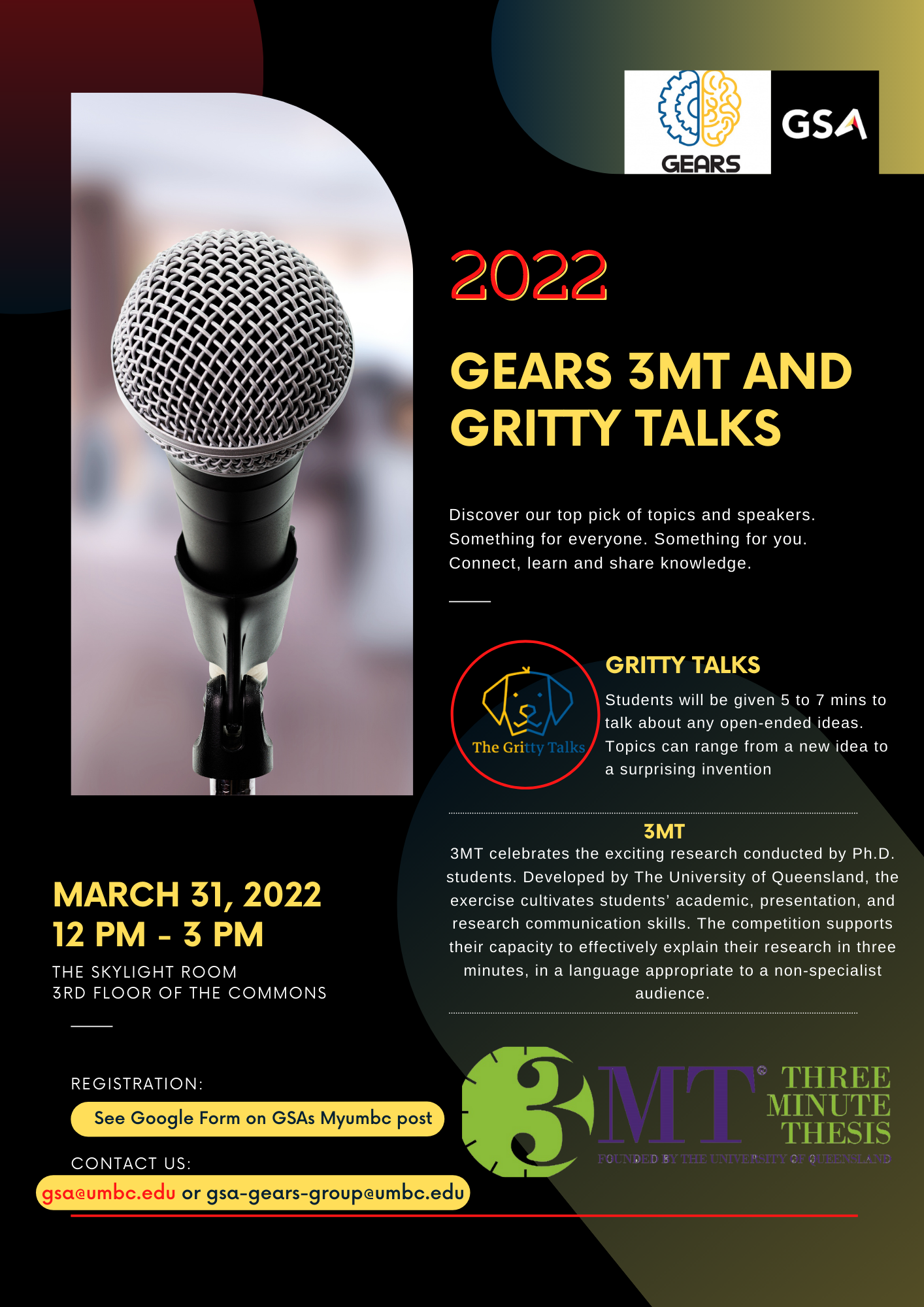 Click Here to Register as in attendance at this years annual 3 Minute Thesis/Gritty Talks. Registration is Due by March 23rd