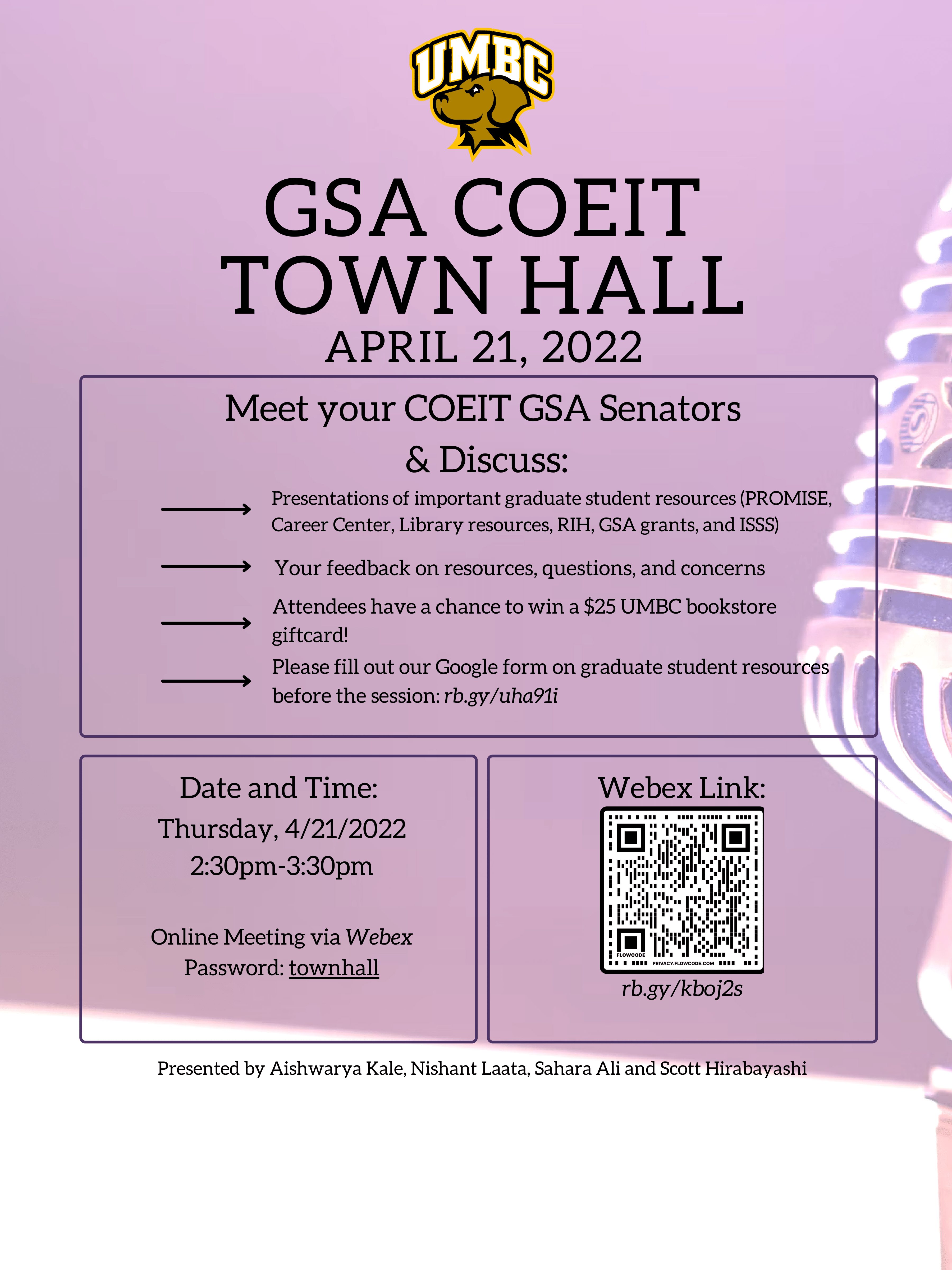 Hosted by The College of Engineering and Information Technology (COEIT)Senators, in our upcoming session, we will share important graduate student resources, including: PROMISE, the Career Center, library resources, RIH (resources for mental and physical health) , GSA grants, and ISSS.