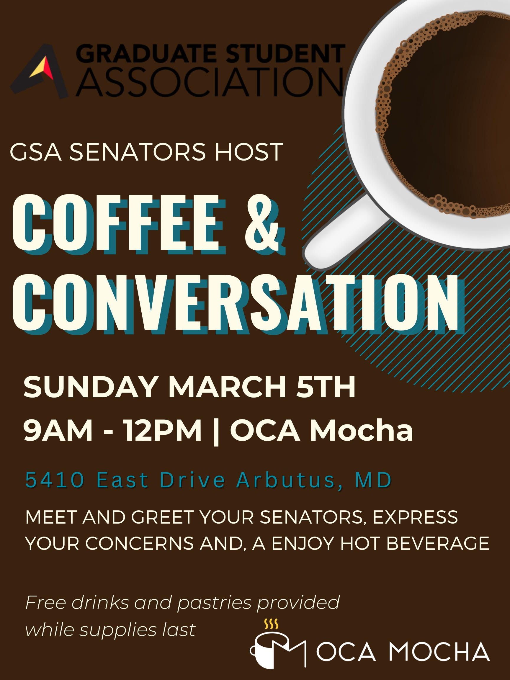 On behalf of the GSA Senators, you are invited to Coffee and Conversation at OCA Mocha on March 5th from 9am - 12pm.