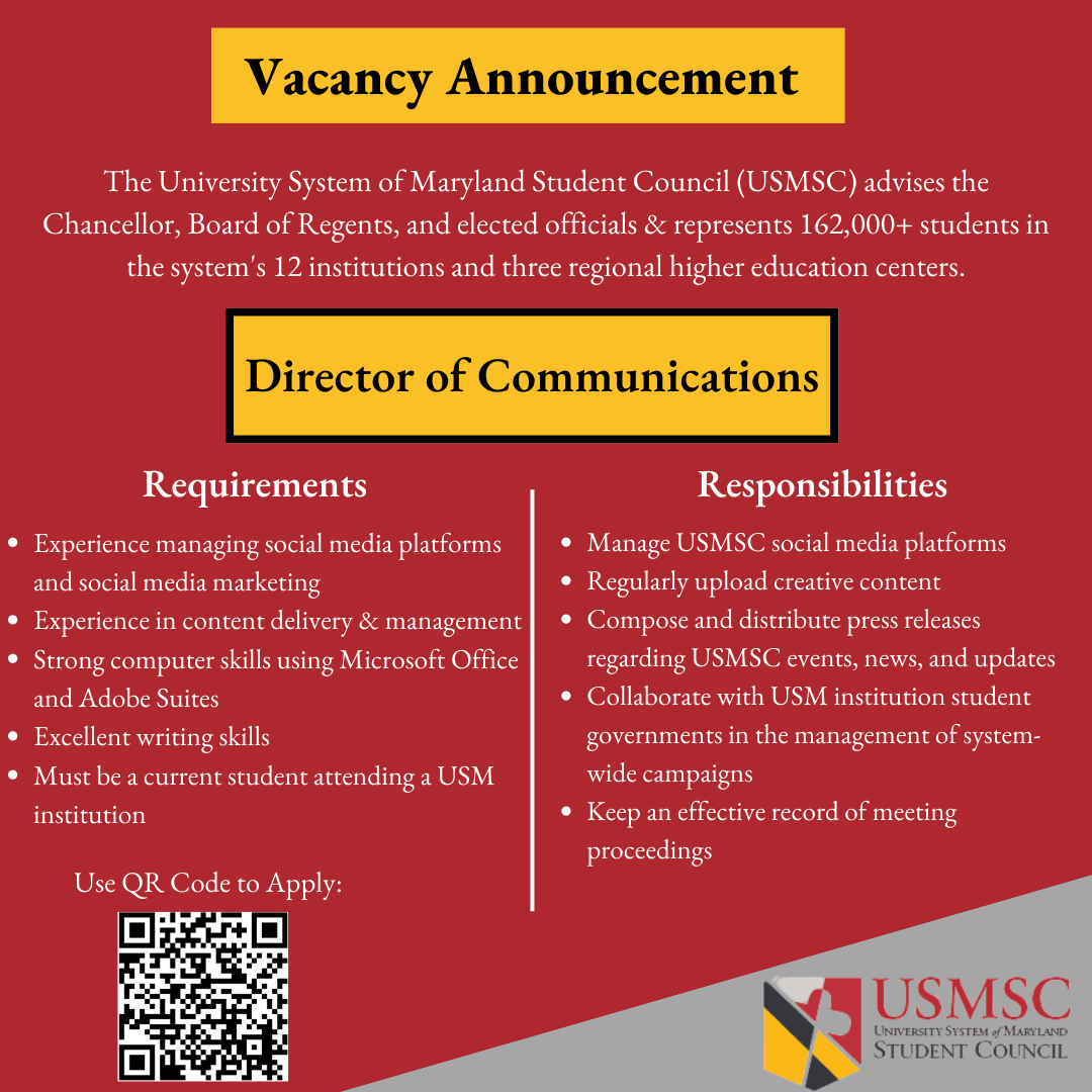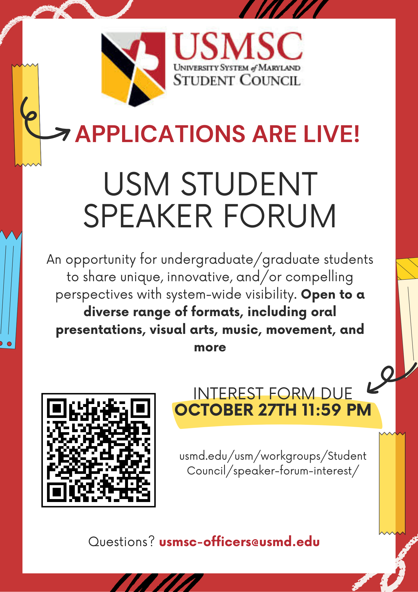 All students are eligible to apply to participate in the first-ever University System of Maryland Student Forum Event! Voice your perspective to the Board of Regents for all the schools in the state university system. The deadline to apply is Oct 27 at 11:59 PM.