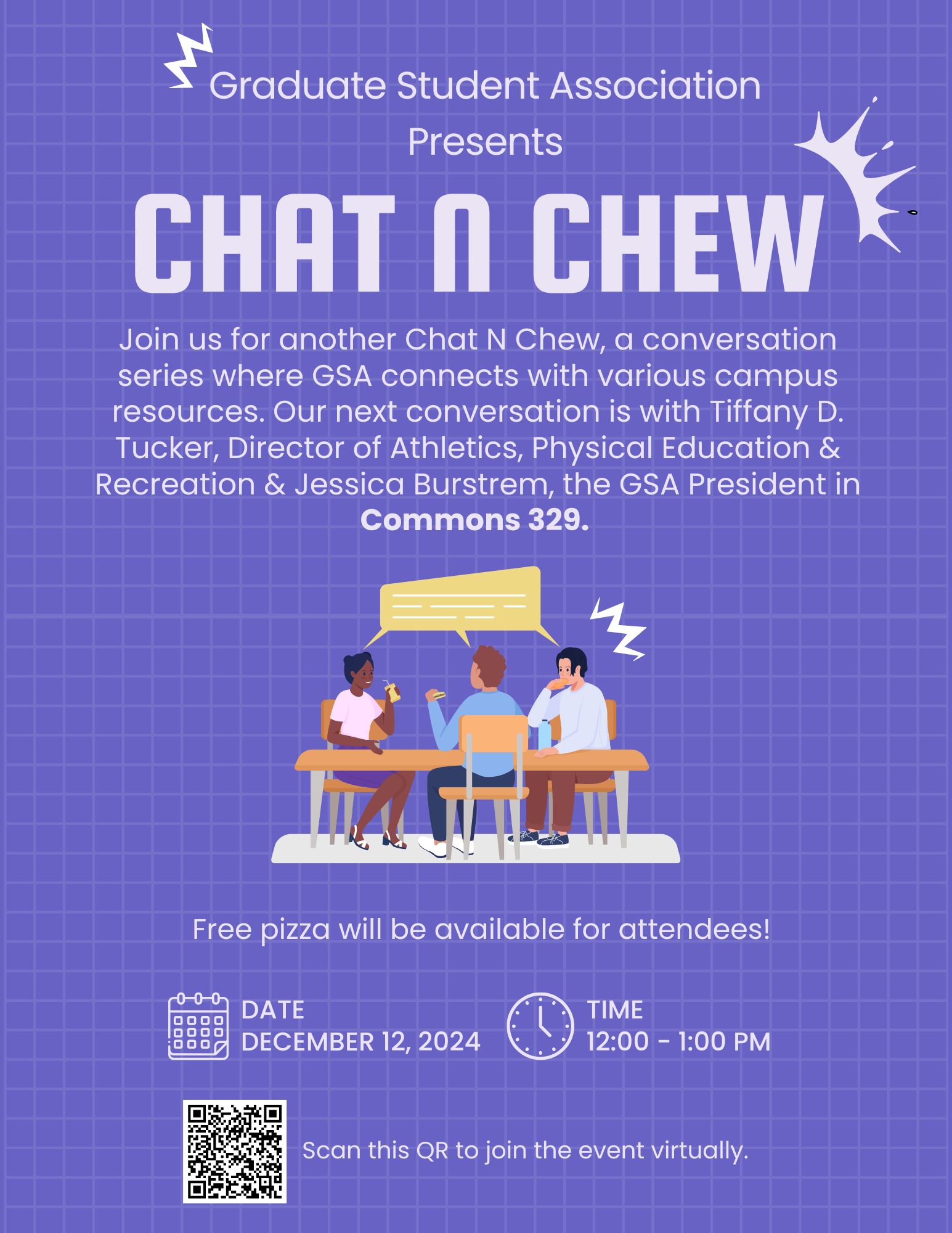 GSA is also hosting another Chat n Chew tomorrow from 1201 in Commons 329. Come ready for an insightful conversation with Tiffany Tucker from Athletics and Jessica Burstrem from GSA. Pizza will be provided.