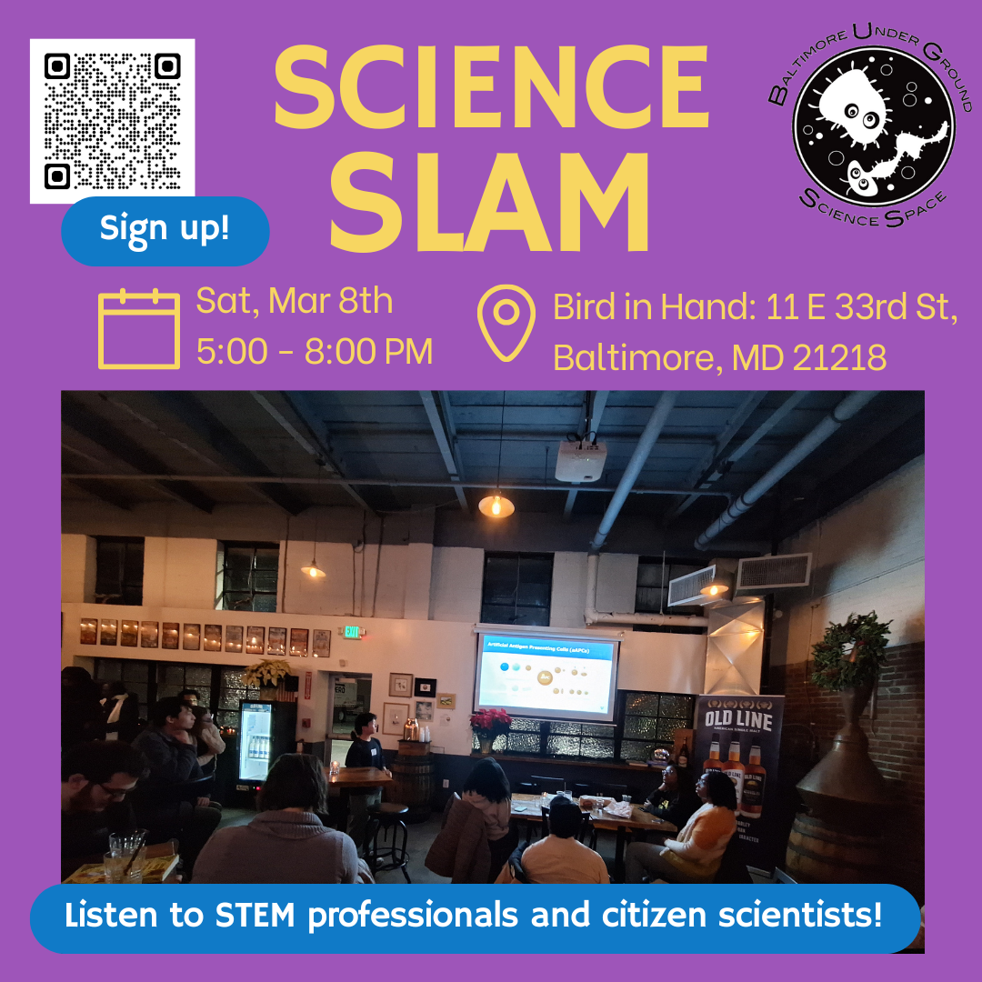 Sign up to give a quick 5-15 minute presentation on your research. This is a perfect opportunity for undergraduate or graduate students. The subject can be any STEM topic of your choosing. The event is geared to the general public. They are happy to help you with tailoring your talk to this audience if needed.