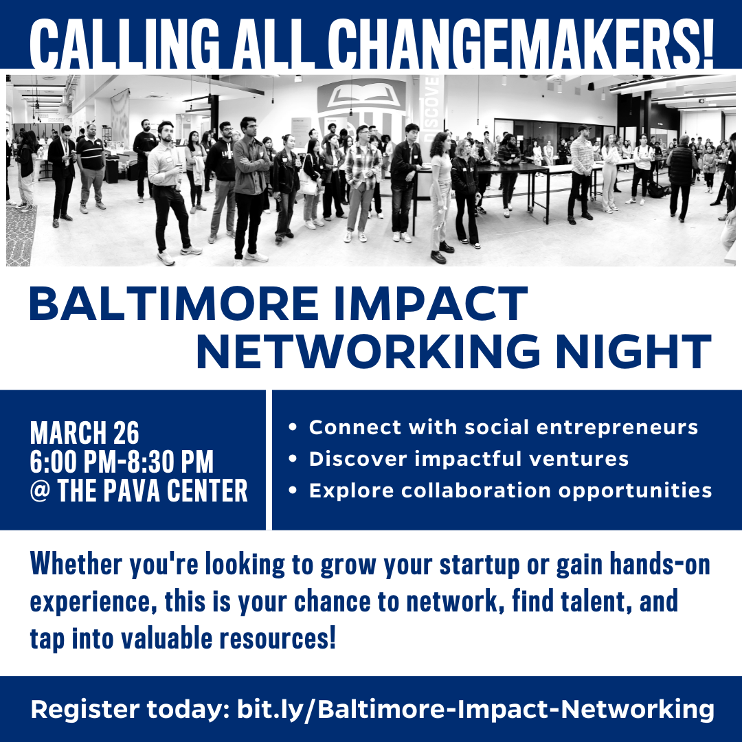 Join the Baltimore Impact Networking Night to connect mission-driven ventures and skilled student talent for an evening of networking and collaboration. This event is designed to foster meaningful connections between Baltimore-based ventures looking to grow and the next generation of student innovators eager to apply their skills to real-world impact. Whether you're a founder seeking talent or a student looking for hands-on experience, the Baltimore Impact Networking Night is where ideas meet opportunity!
