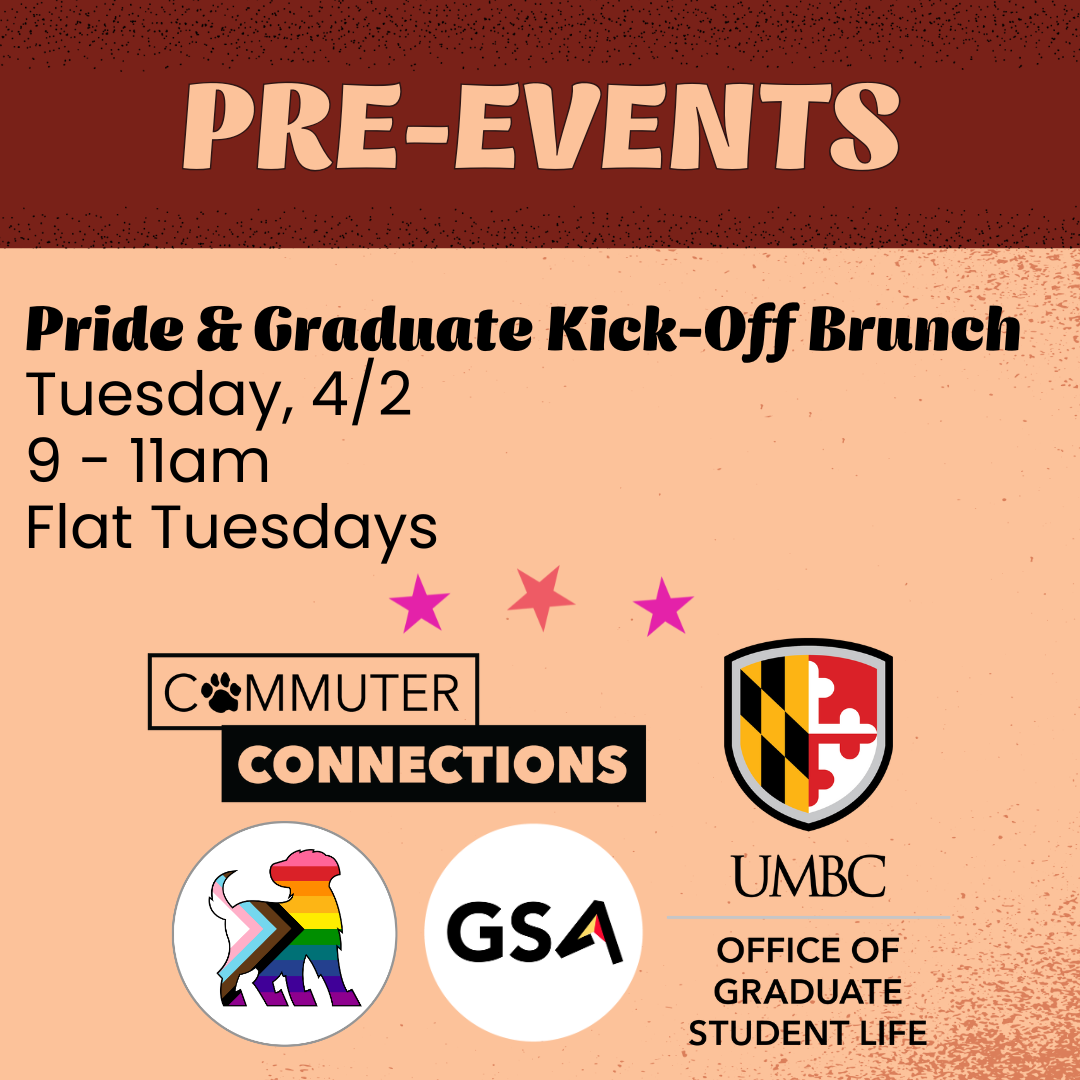 Join us for a Pride Week & Graduate Student Week Kick-Off Brunch, co-sponsored by The Graduate Student Association, the Office of Graduate Student Life, Commuter Connections and Student Belonging! Show off your favorite brunch outfit, or whatever you happen to wear on a Wednesday morning in April.