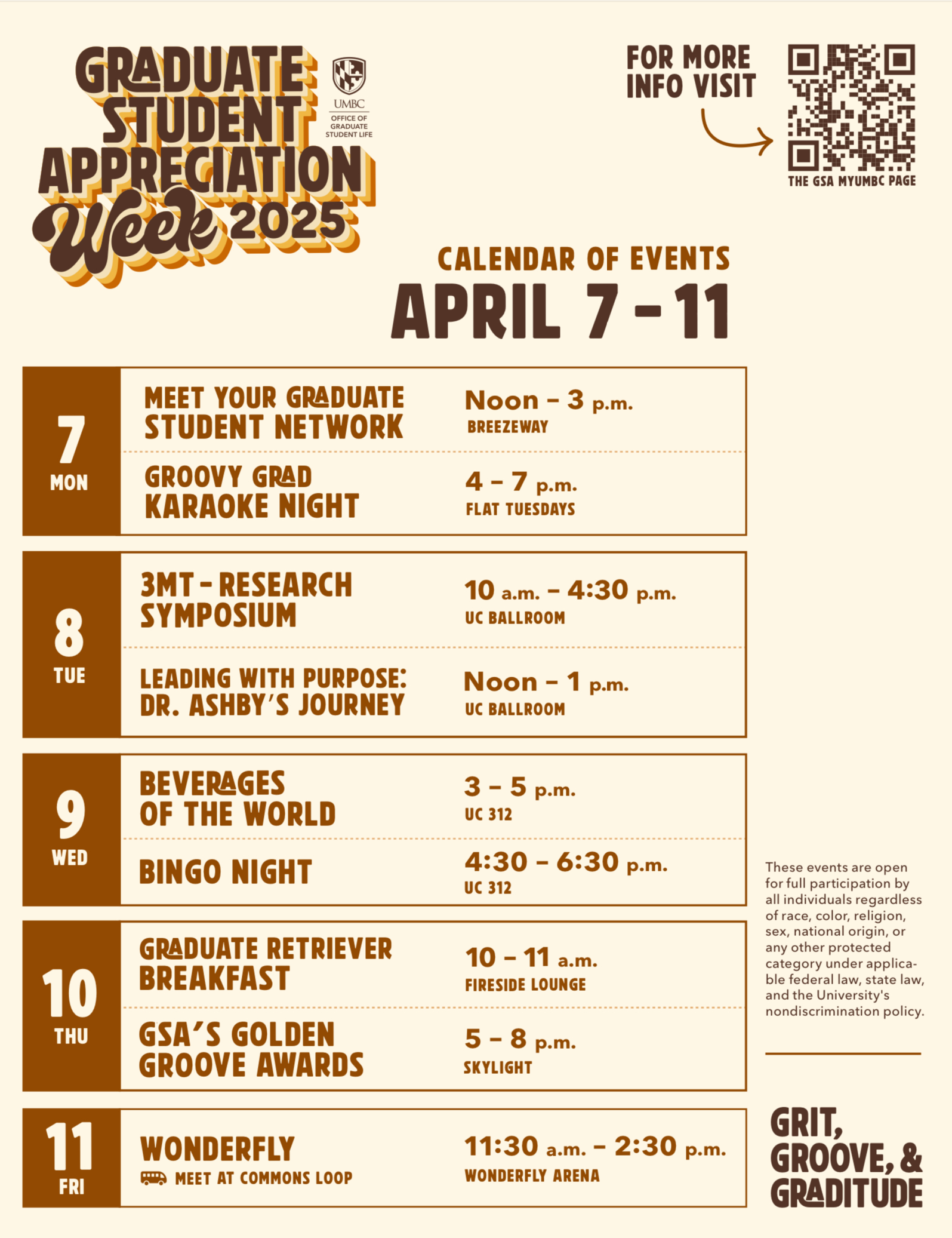 Get ready to celebrate you, UMBC grad students! This week is all about Grit, Groove, and Graditude. We're recognizing the incredible strength, spirit, and contributions of our graduate student community. We’ve got a lineup of awesome events planned just for you, so take a break, connect, and enjoy everything that makes this community so special. Stay tuned and join the celebration, you’ve earned it! The flyer here is a highlight of events this week, for more events and info please visit our events page here.