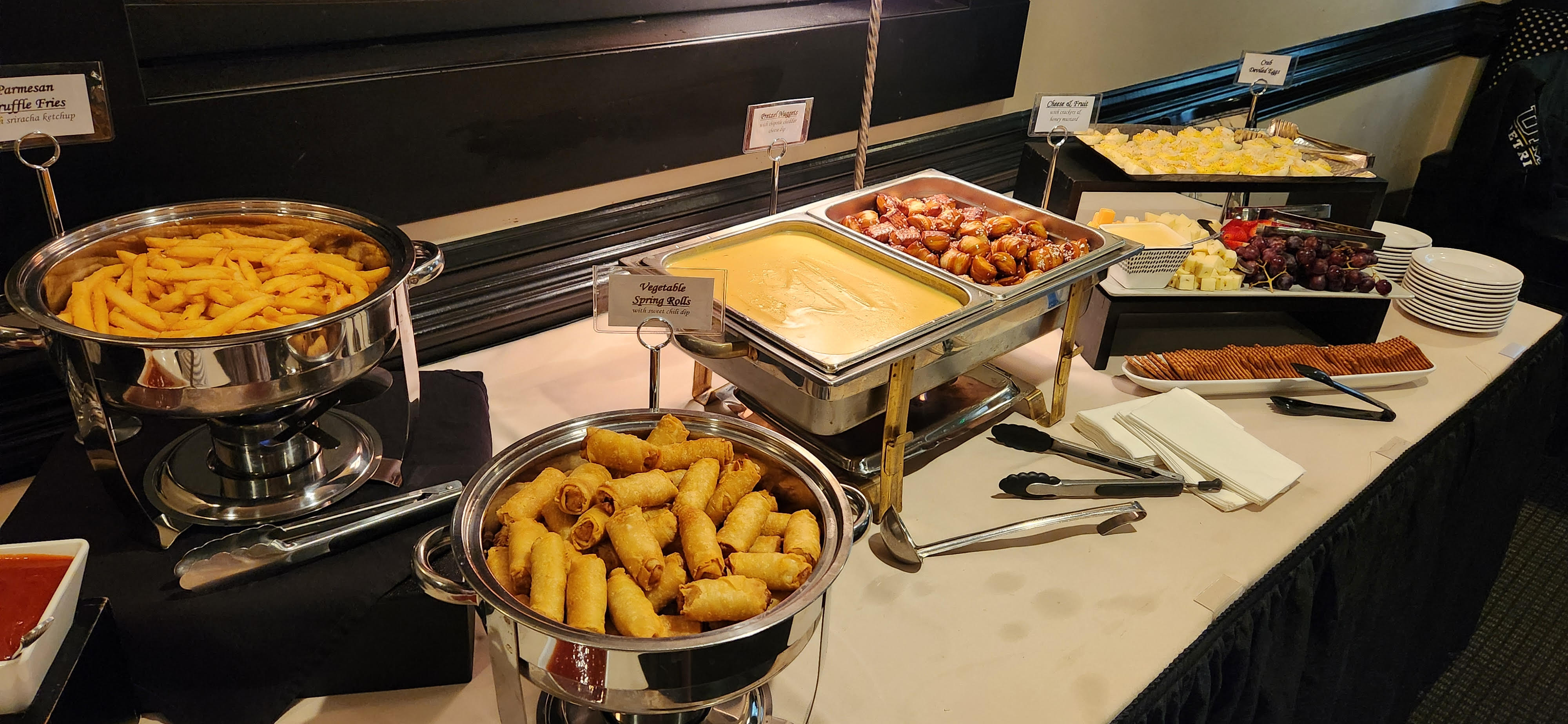 Bang Bang Shrimp, Vegetable Spring Rolls, Crab Deviled Eggs, Parmesan Truffle Fries, Pretzel Nuggets, and Artisanal Cheese & Fruit