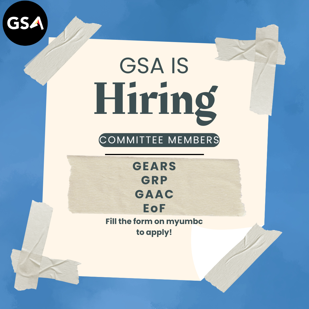 Are you passionate about advocacy, event planning, research, or policy? The Graduate Student Association (GSA) is now recruiting paid committee members for the 2025–2026 academic year! This is your opportunity to grow as a leader, collaborate with fellow students, and support the graduate community at UMBC.