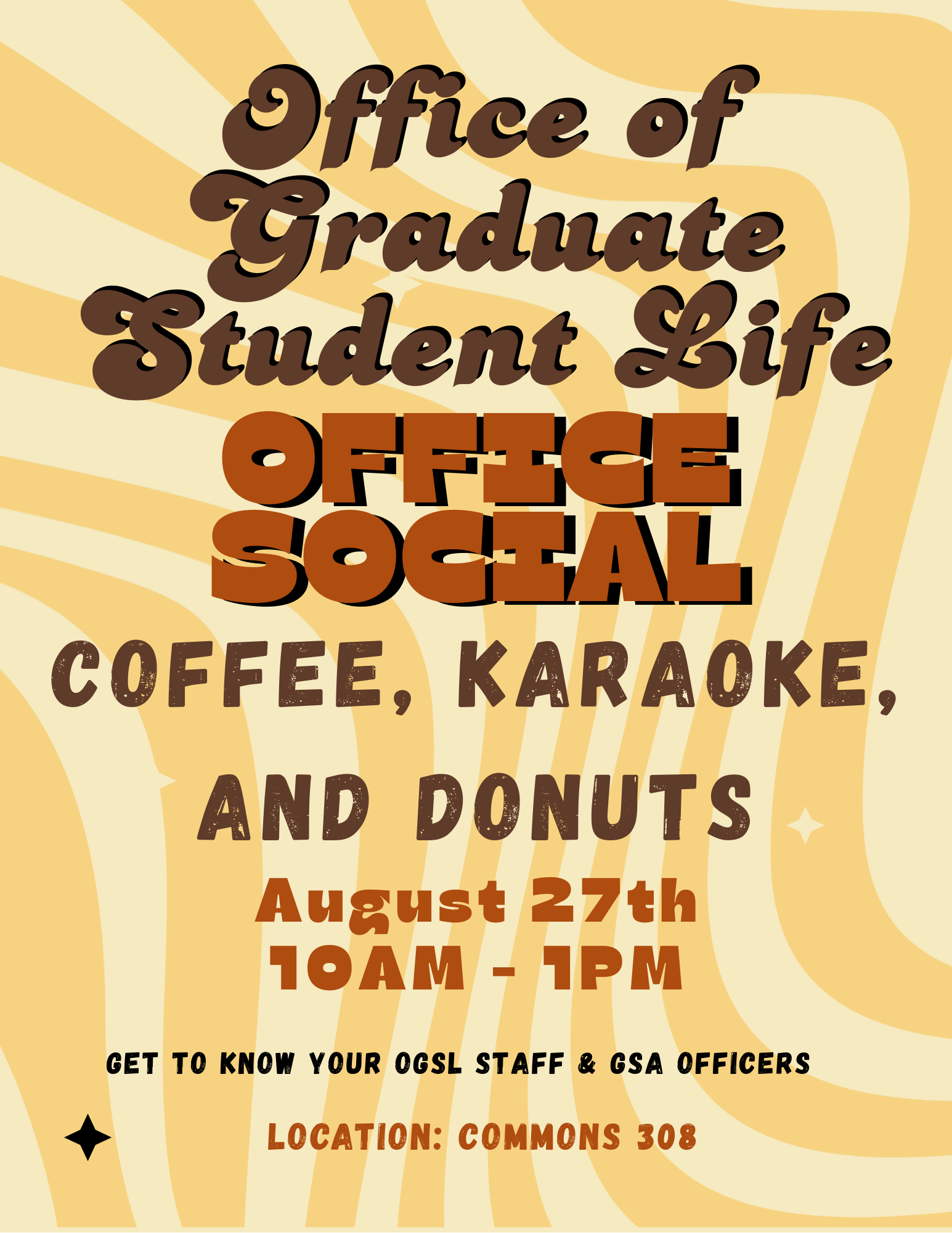 Come join the Office of Graduate Student Life (OGSL) for our Office Social on Wednesday, August 27th from 10 AM – 1 PM in Commons 308! We’ll have free coffee, donuts, and karaoke along with the chance to meet OGSL staff and Graduate Student Association (GSA) officers. It’s a great way to connect with fellow graduate students, learn about resources, and start the semester off with fun and community.
