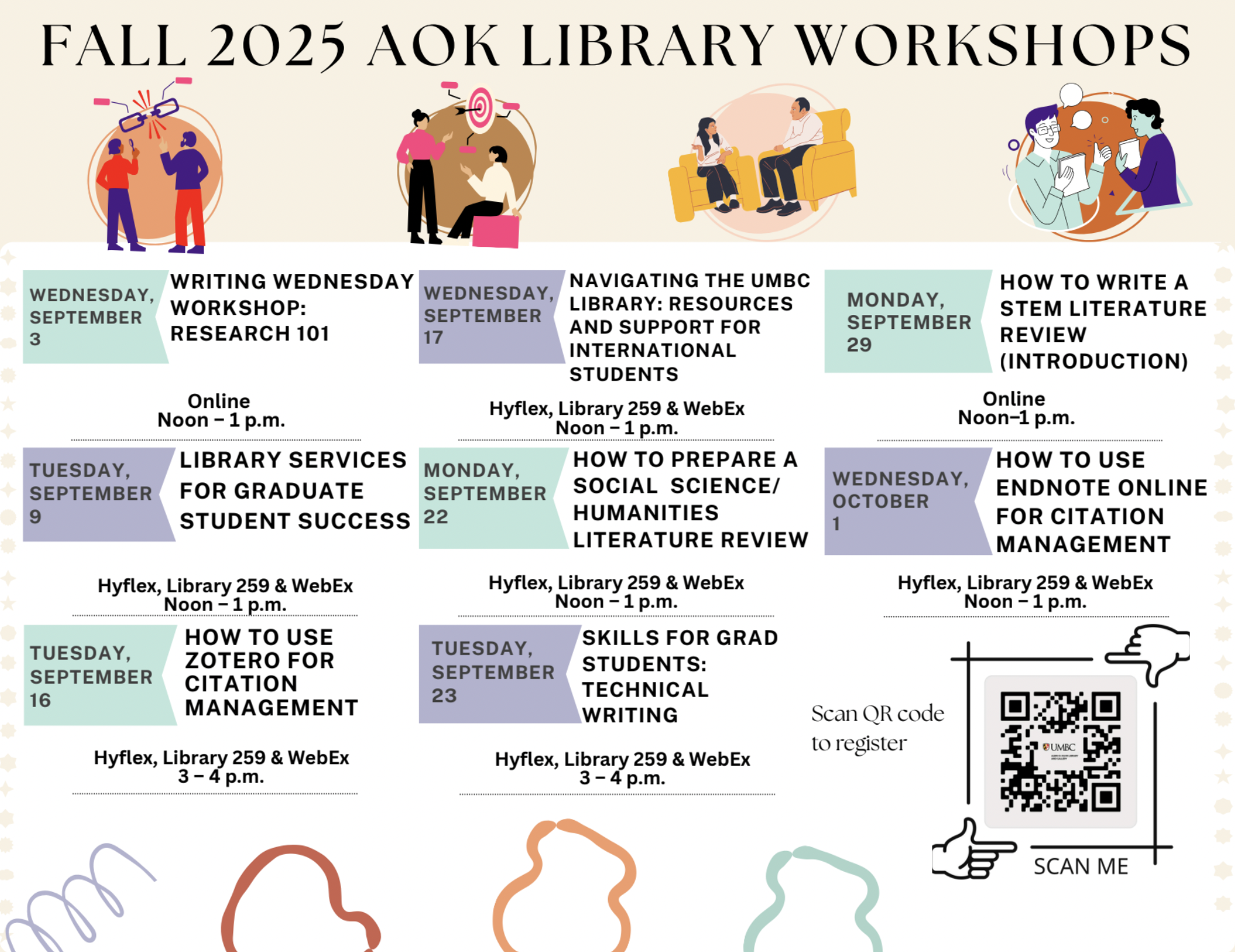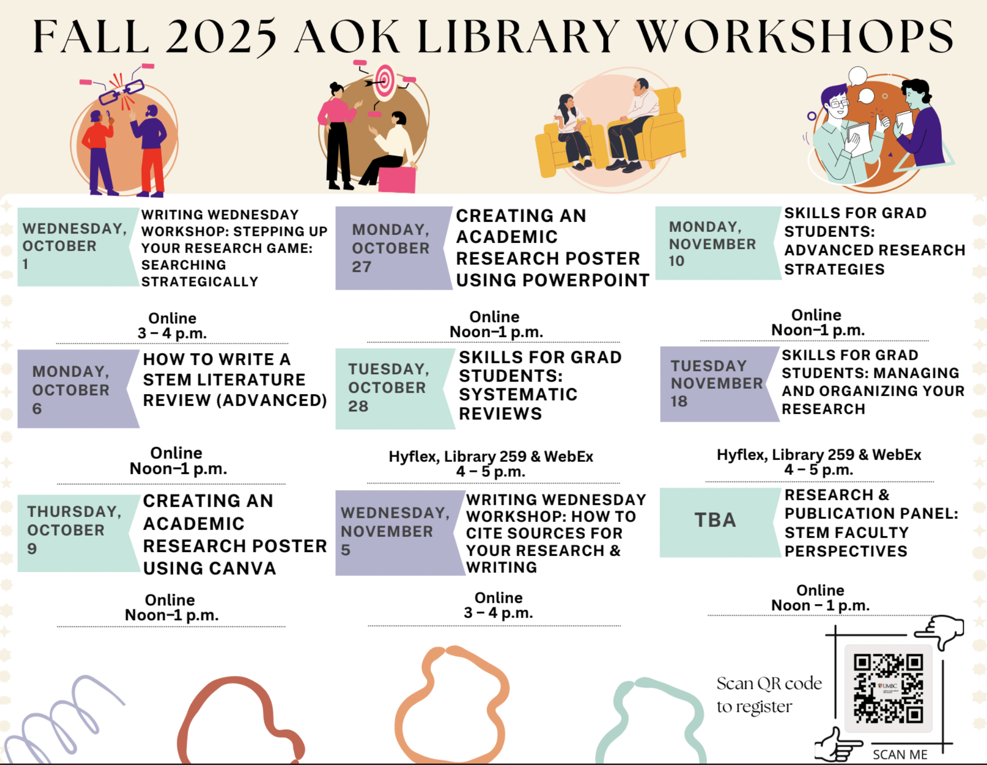The AOK Library is hosting a wide range of workshops all semester long to support your research, writing, and academic success! From learning how to manage citations with Zotero & EndNote, to preparing literature reviews, creating research posters, and sharpening your technical writing—there’s something for every grad student.