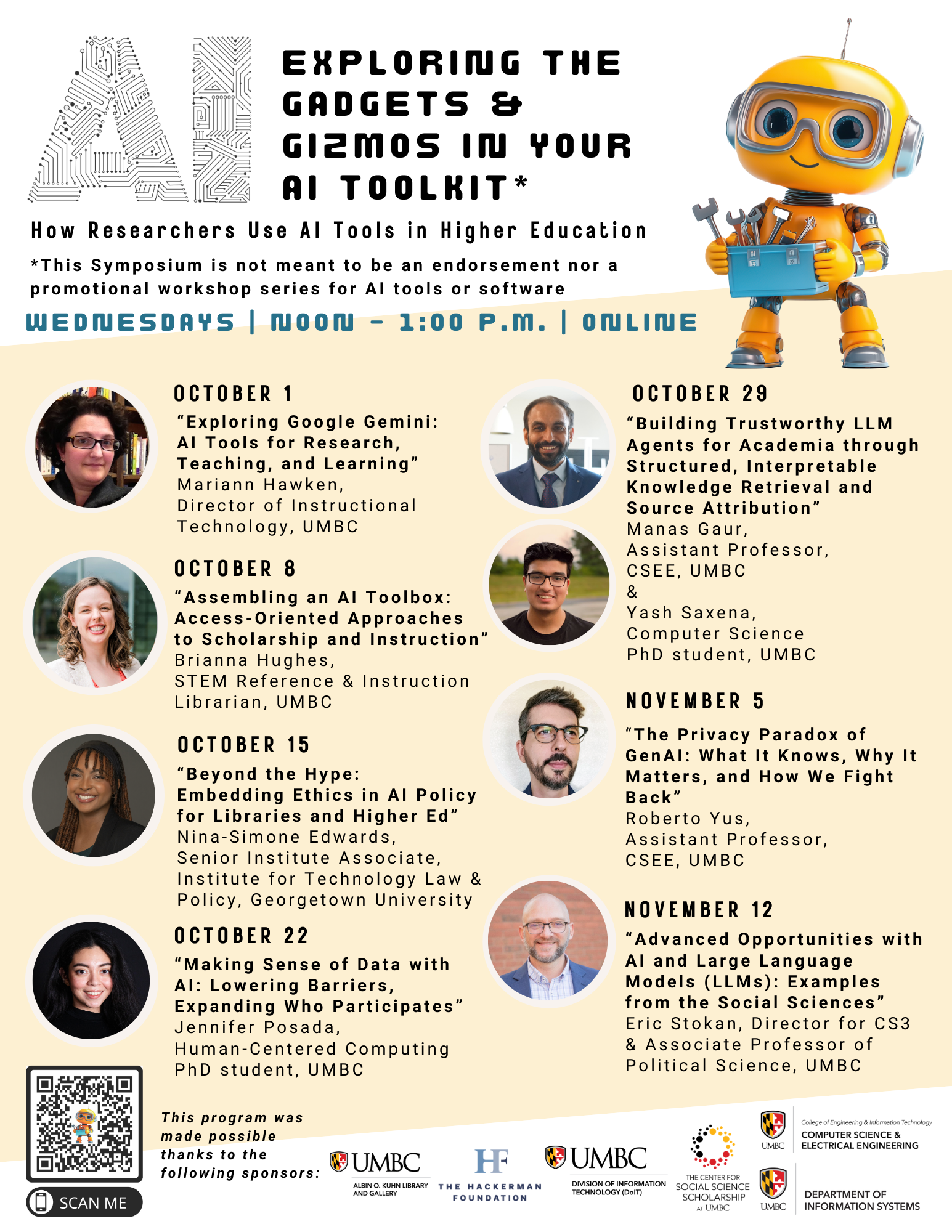 On the heels of the successful “AI, Privacy, and Ethics Symposium” of April 2024, we’re back with a new iteration! Please join us for this fall’s AI Symposium, titled “Exploring the Gadgets & Gizmos in Your AI Toolkit.” This fall’s series will highlight various topics ranging from Google Gemini and its integration into UMBC platforms, to the broader legal implications of using generative AI, and much more! This free symposium will be held virtually at noon via Webex on Wednesdays beginning October 1st through November 12th.