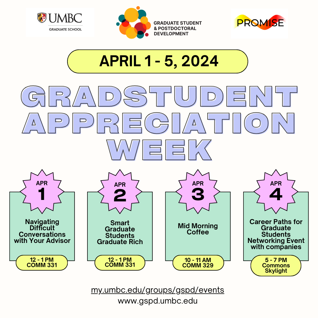 The Graduate School at UMBC, the Office of Graduate Student and Postdoc Professional Development, and the PROMISE Program, have put together a couple of events to show appreciation for our talented Graduate Students at UMBC!