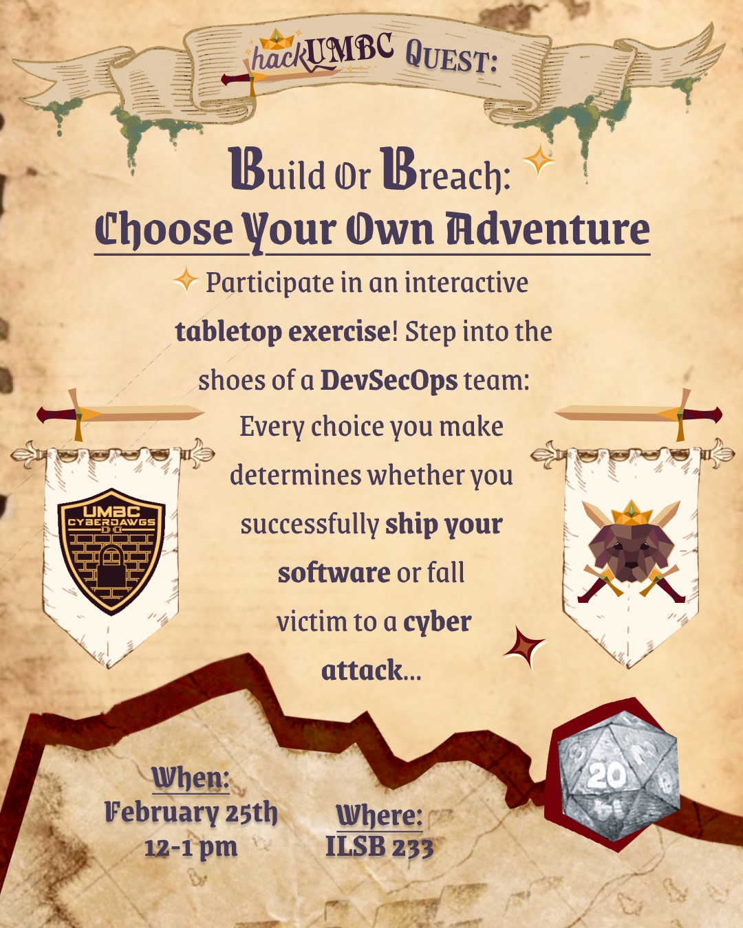 On February 25th from 12-1pm in ILSB 233, students will step into the role of a DevSecOps team in a choose-your-own-adventure tabletop exercise. Through guided discussion, you'll work through realistic software security scenarios and decide how to respond to emerging threats.