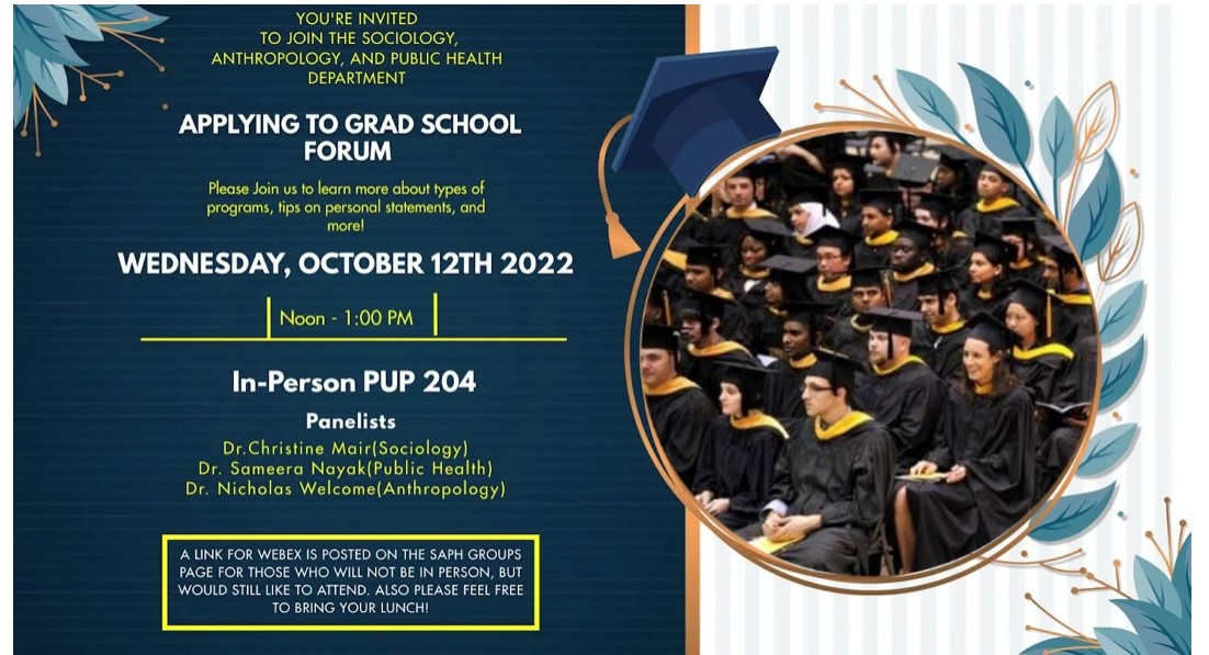Hi Everyone! Don't forget that tomorrow, at noon, is the applying to Grad School Forum. It would be a great opportunity for students interested in pursuing a graduate degree. Dr. Nayak will be able to answer any questions you may have about graduate school and degrees in public health and/or other related fields.