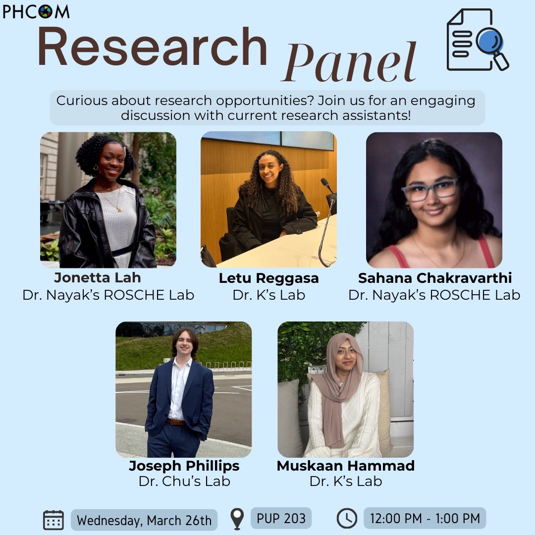 Join PHCOM this Wednesday, March 24th at the PUP 203 from 12pm for an engaging conversation with peers to learn how to get involved in research at UMBC and get insights and reflections on their research experience!!