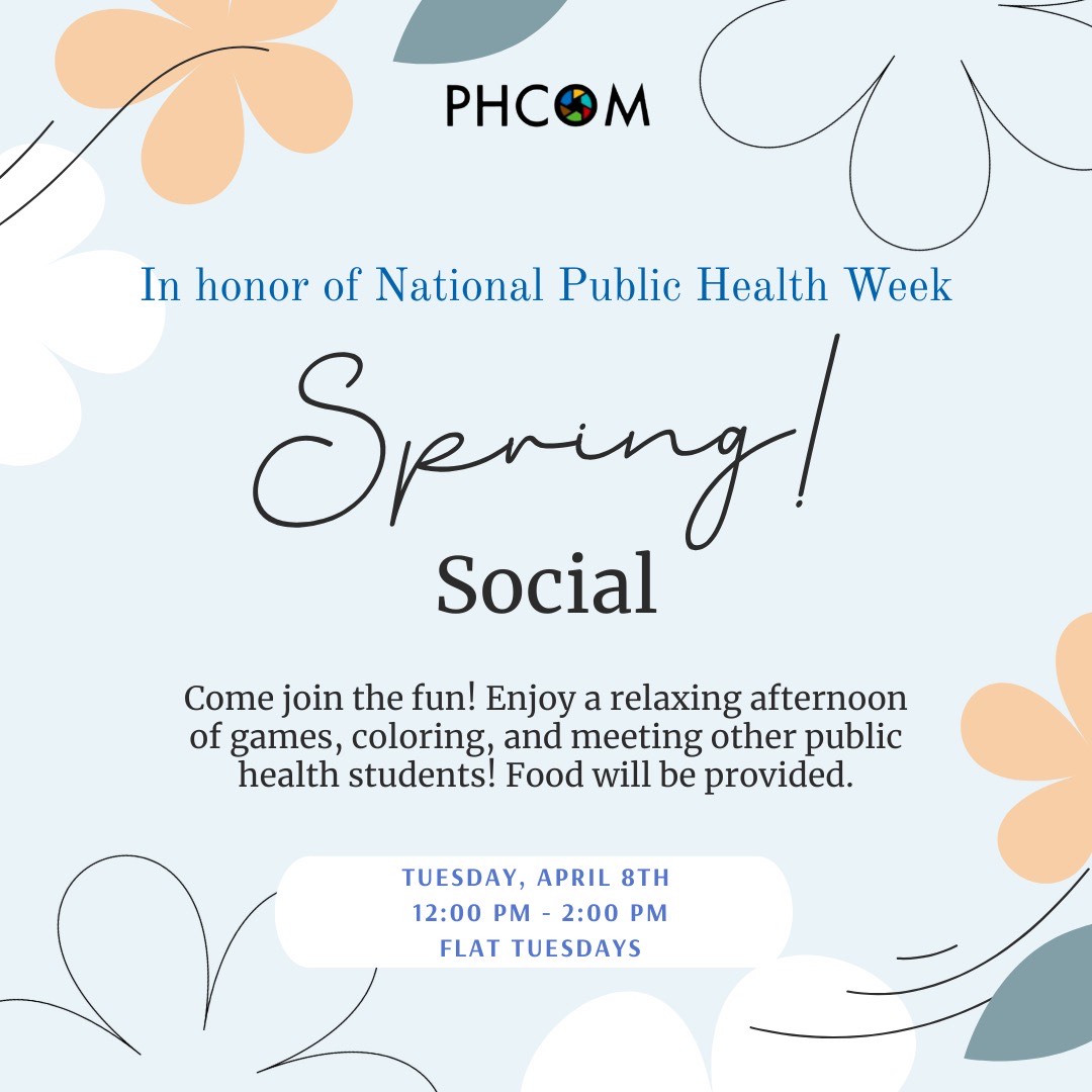 Join PHCOM for the spring social in honor of the National Public Health Week. We will have food and games! Come and destress with us! The event is on Tuesday, April 8th from 12 - 2 pm at Flat Tuesdays.