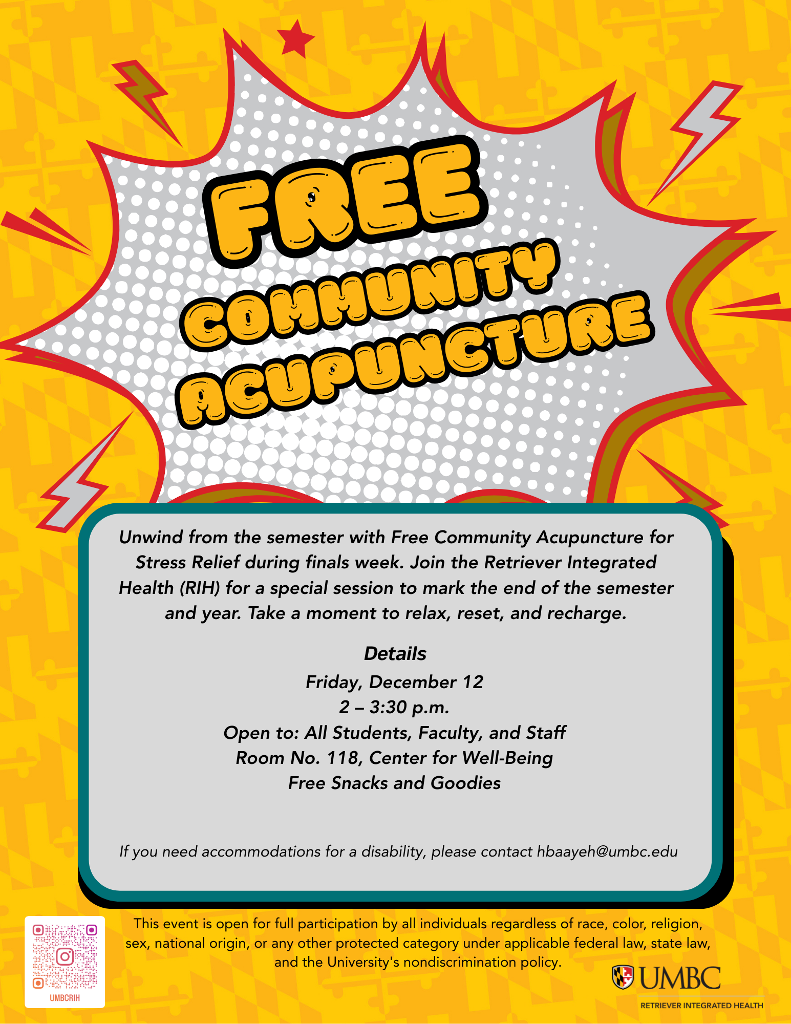 Take a breather today and drop by the Center for Well-Being, Room 118 between 2–3:30 PM for a relaxing acupuncture session hosted by UMBC RIH. It's the finals-week breather you've been craving : peaceful energy, a calming space, and of course… free snacks and goodies.