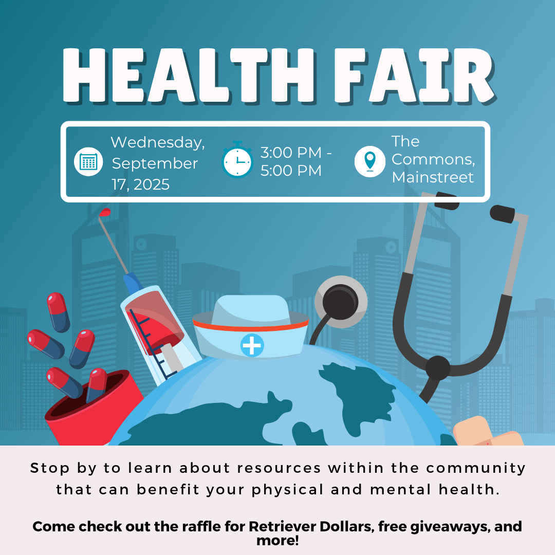 Join us on Wednesday, September 17, 2025 from 3:00PM-5:00PM at The Commons on Mainstreet as we learn about the different resources on and off-campus that can benefit our health. There will be giveaways, a raffle, and snacks available!