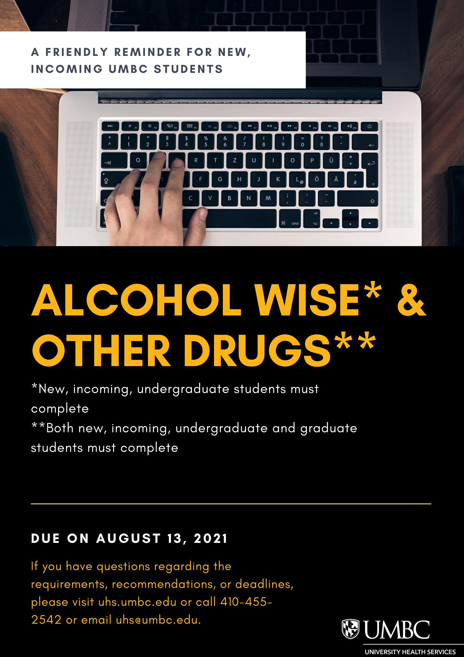 As part of our comprehensive prevention program for new incoming first year and/or transfer undergraduate and graduate students, UMBC requires that new, undergraduate students complete Alcohol-Wise and Other Drugs and new, graduate students complete Other Drugs. These online courses will empower you to make healthy, well-informed decisions about issues that affect your college years and beyond.