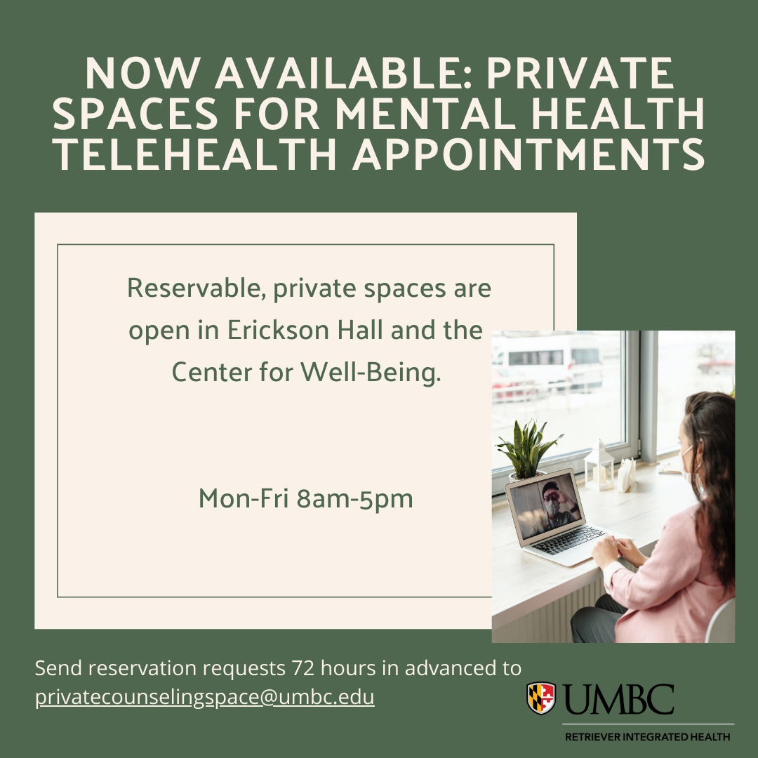 The Center for Well-Being and Erickson Hall have reservable, private spaces from which students may participate in virtual appointments with their community-based mental health providers. These are available between 8am and 5pm, Monday through Friday when the campus is open. To reserve a space, please send an email with your desired reservation date and time to privatecounselingspace@umbc.edu. If we cannot accommodate your request, we will get back to you to discuss other available times. All reservation requests should be made at least 72 hours in advance.
