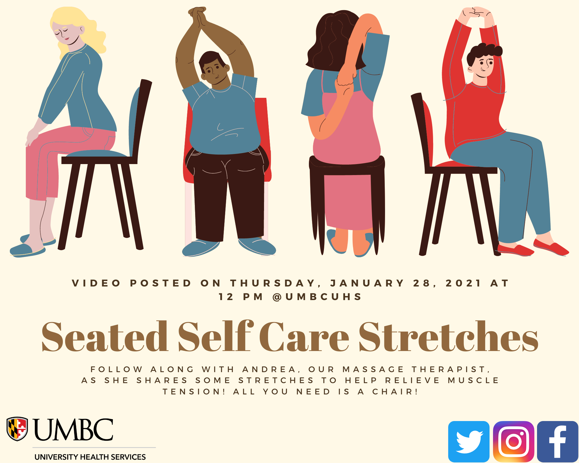 Follow along with Andrea, our massage therapist, as she shares simple stretches to relieve muscle tension. These stretches can easily be incorporated into your busy schedule!