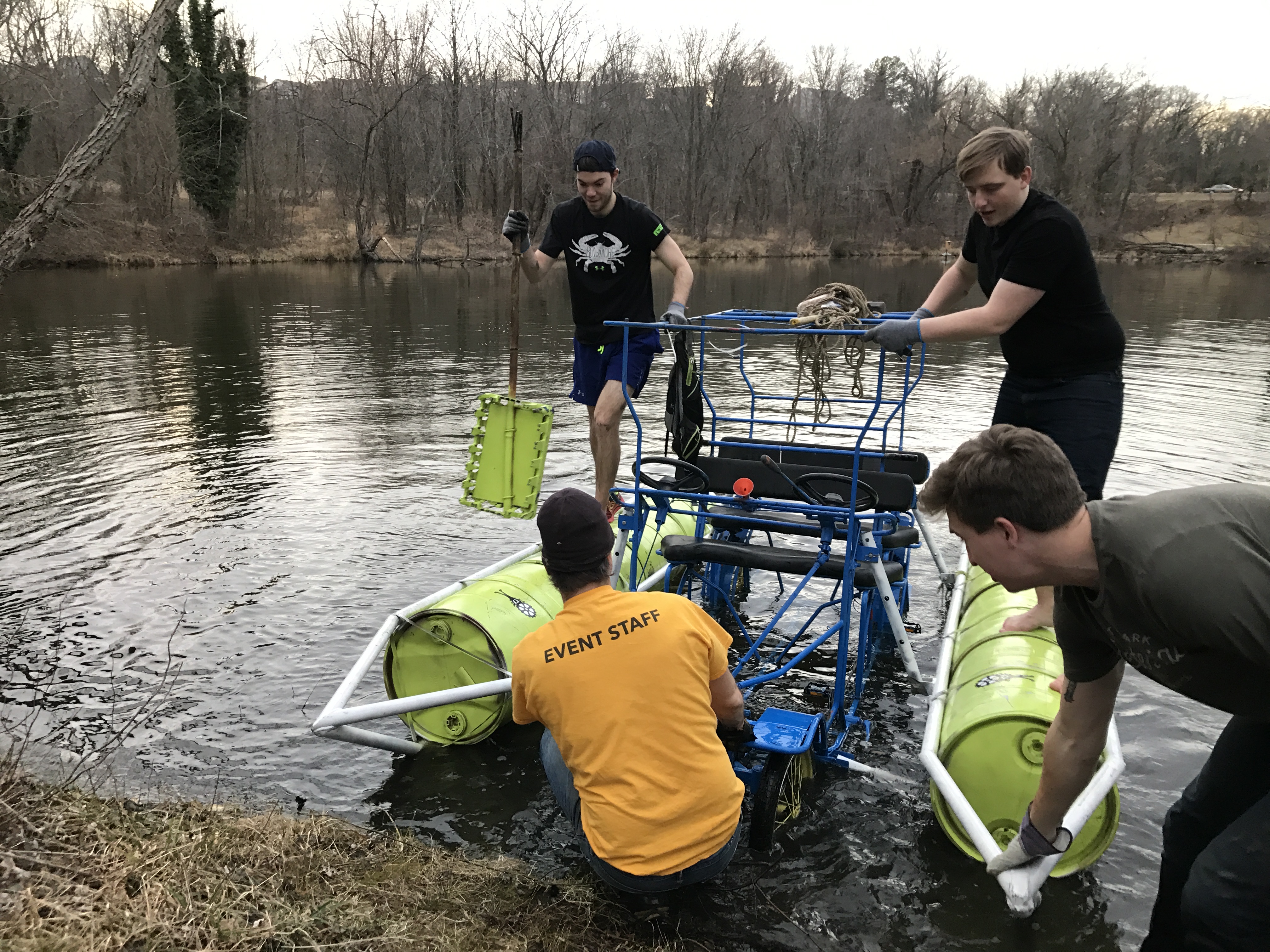 Using the Interdisciplinary Studies Department Kinetic Sculpture, the Kracken, members of the Herbert Run Greenway team install a new Wood Duck mating box.