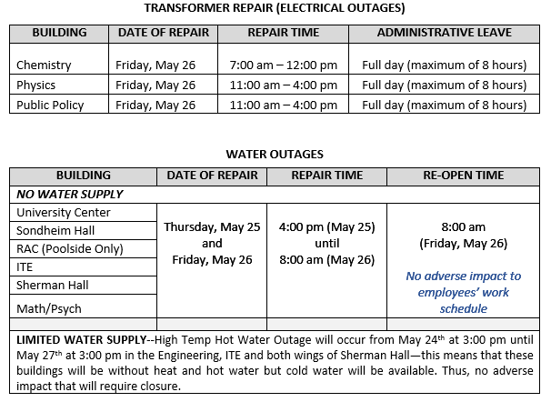 On May 26, 2017, the Chemistry, Physics and Public Policy buildings will undergo facilities maintenance that will require building closures. Employees who work in these buildings and are scheduled to work on May 26, will be given Administrative Leave (ADM) for the day. Below is the repair schedule.