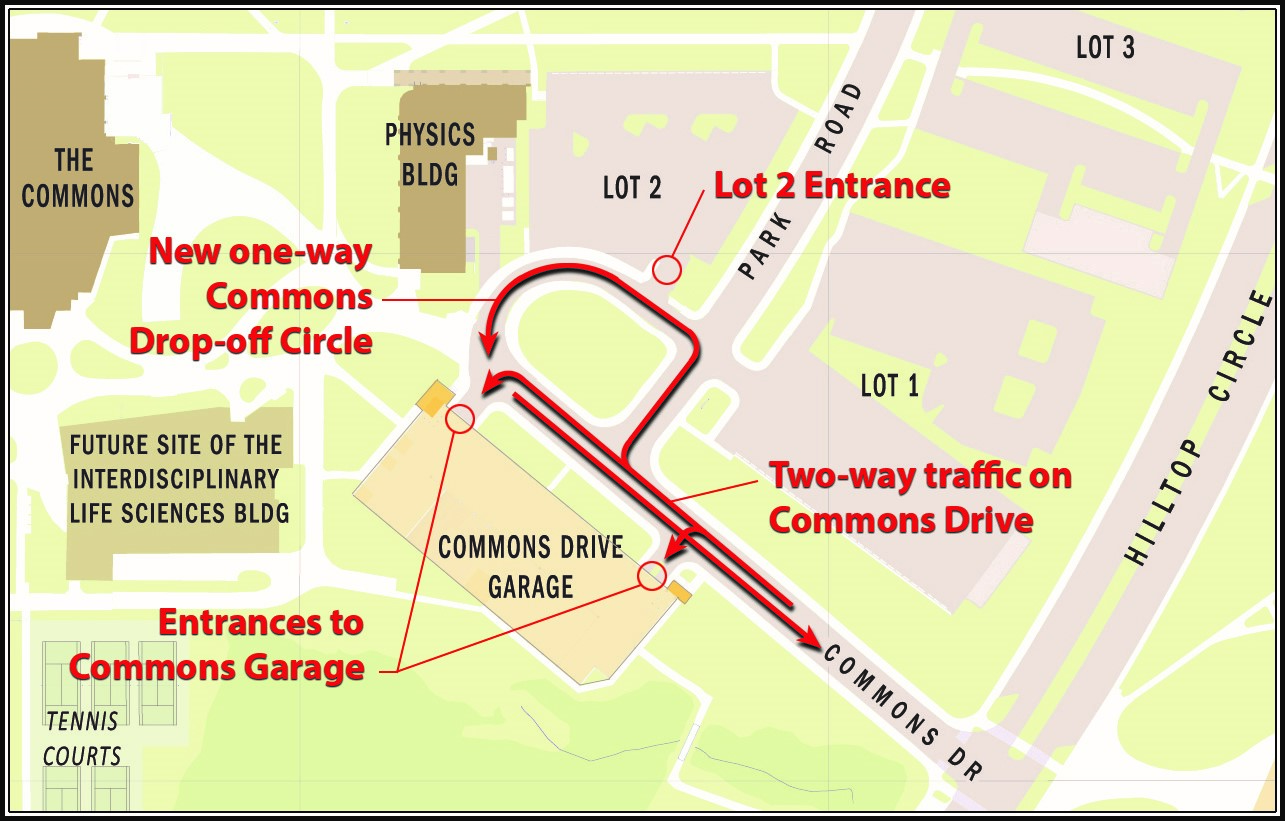 Please be advised that there will be permanent changes to the traffic patterns in the area of Commons Garage, Physics Building and The Commons prior to the start of the Fall 2017 semester. The Commons Circle is being replaced with a new drop-off circle between the Physics Building and Commons Garage. The new circle will provide a drop-off area for The Commons, Physics and other adjacent buildings. Personal vehicles will no longer be allowed to enter the Commons Circle as this area is now limited to service vehicles and deliveries. A new entrance to Lot 2 has also been constructed off of the new drop-off circle.