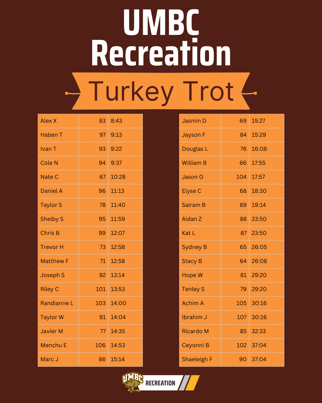 PNG Image · 204 KBThank you to everyone who came to the Monster Dash. The finisher times are attached. We will see you on November 19th for the Turkey Trot.