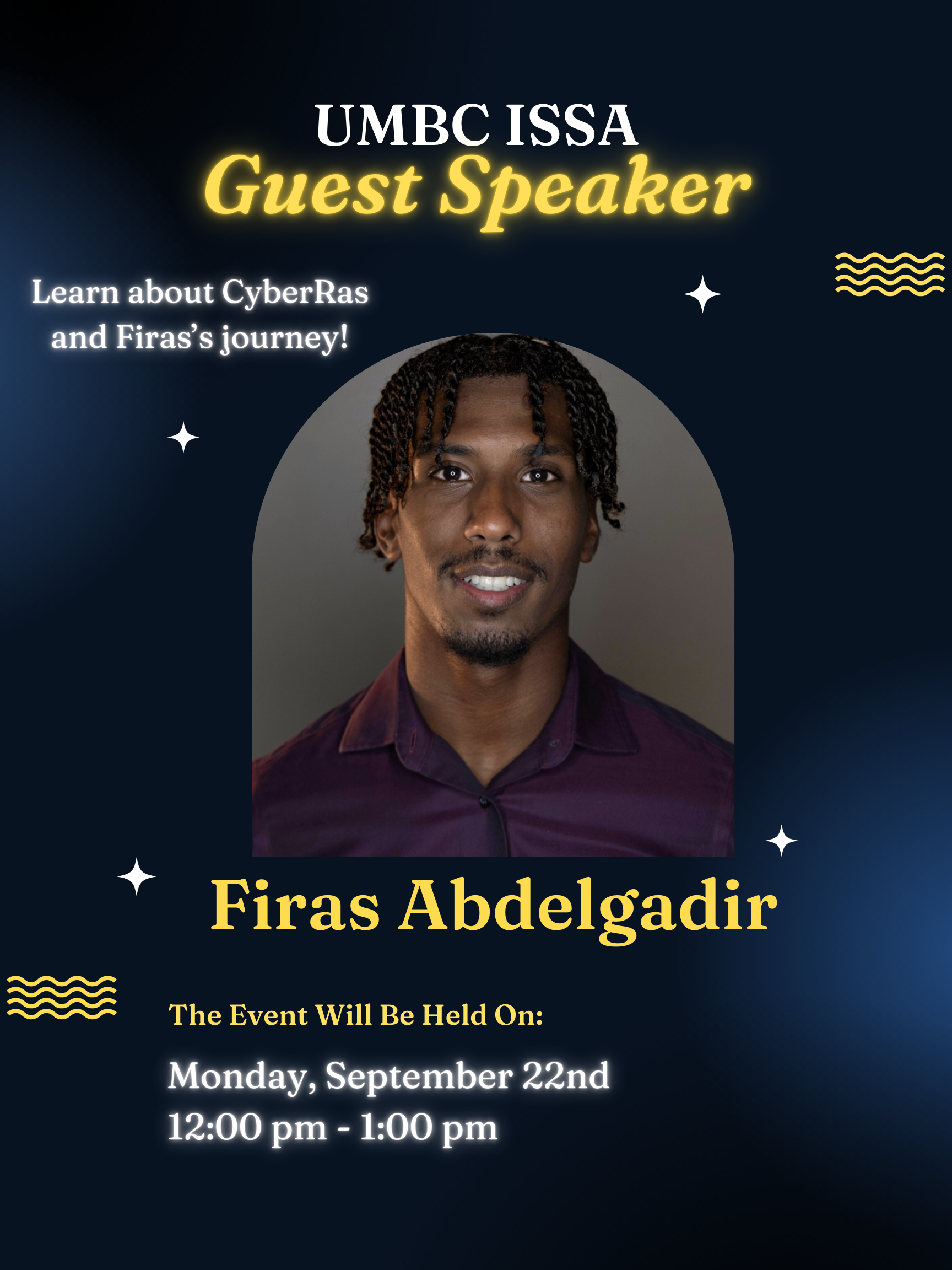 Join us for our General Body Meeting on Monday, September 22th, from 12 p.m. to 1 p.m in ITE 459. Our first guest speaker is Firas Abdelgadir representing the CyberRas Foundation! Enjoy some pizza, bring a friend and hear about Firas's journey!