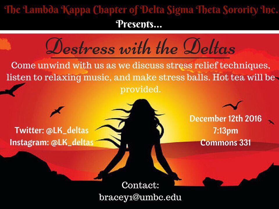 'Tis the season for finals! We understand how stressful finals and the end of the semester can be. So please come destress with us on December 12th at 7:13 pm. Hope to see everyone TONIGHT!!!!!!DeSTress With the Deltas