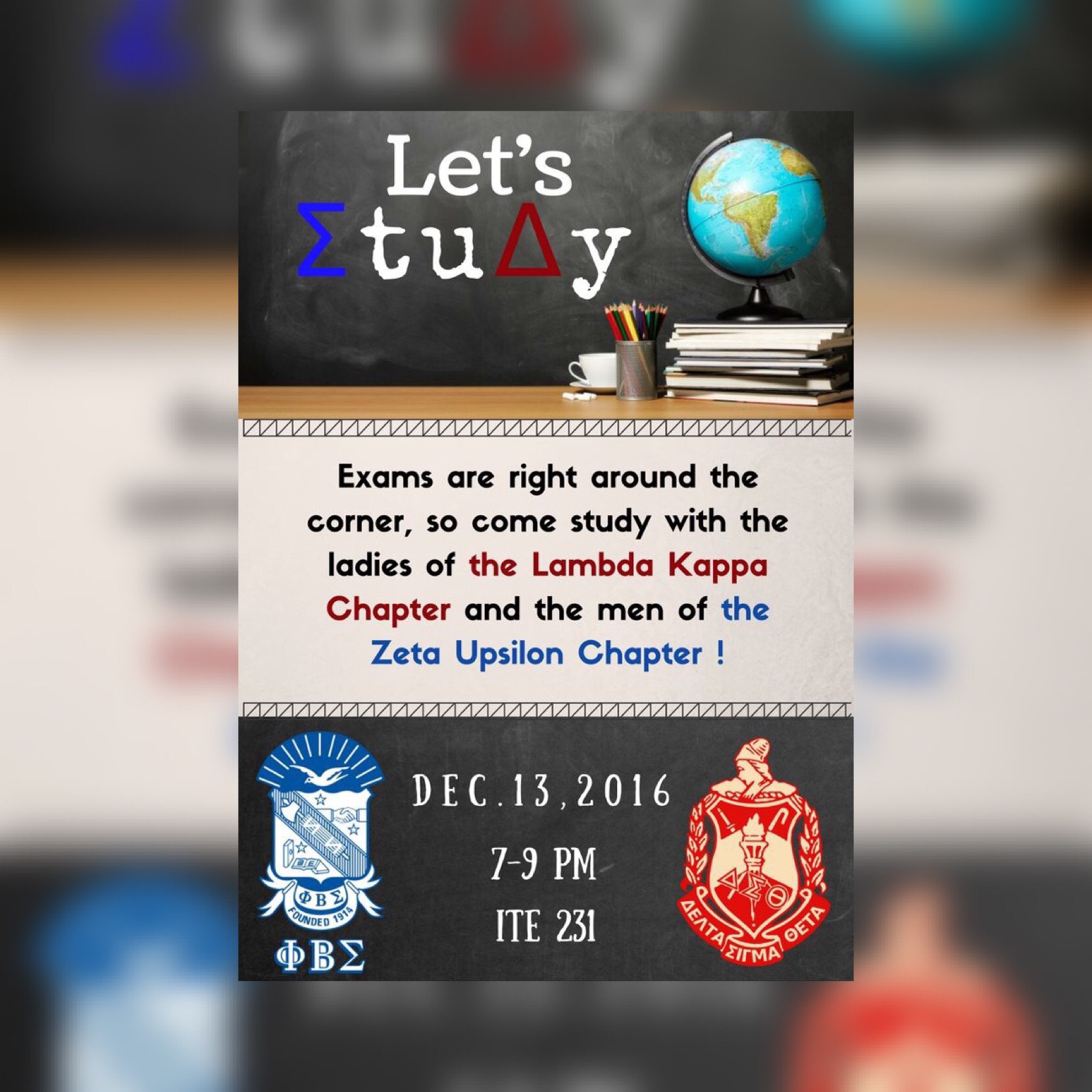 Come and study with us and the men of the Zeta Upsilon Chapter of Phi Beta Sigma Fraternity, Inc. This Tuesday Dec. 13 from 7-9pm. See you there!!!